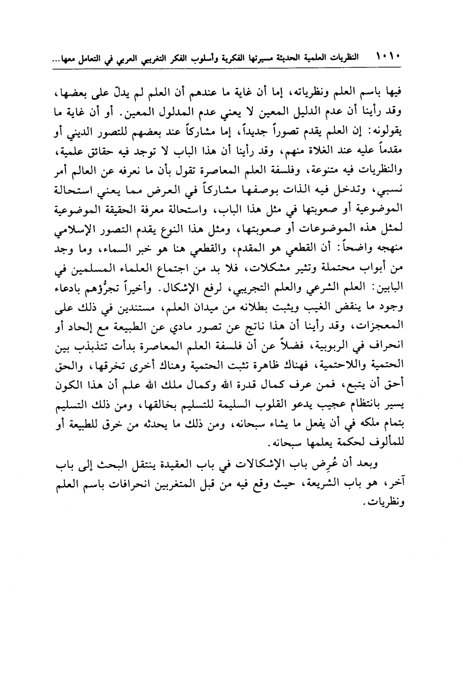 فيها باسم العلم ونظرياته، إما أن غاية ما عندهم أن العلم لم يدلّ على بعضها، وقد رأينا أن عدم الدليل المعين لا يعني عدم المدلول المعين. أو أن غاية ما يقولونه: إن العلم يقدم تصورًا جديدًا، إما مشاركًا عند بعضهم للتصور الديني أو مقدمًا عليه عند الغلاة منهم، وقد رأينا أن هذا الباب لا توجد فيه حقائق علمية، والنظريات فيه متنوعة، وفلسفة العلم المعاصرة تقول بأن ما نعرفه عن العالم أمر نسبي، وتدخل فيه الذات بوصفها مشاركًا في العرض مما يعني استحالة الموضوعية أو صعوبتها في مثل هذا الباب، واستحالة معرفة الحقيقة الموضوعية لمثل هذه الموضوعات أو صعوبتها، ومثل هذا النوع يقدم التصور الإِسلامي منهجه واضحًا: أن القطعي هو المقدم، والقطعي هنا هو خبر السماء، وما وجد من أبو اب محتملة وتثير مشكلات، فلابد من اجتماع العلماء المسلمين في البابين: العلم الشرعي والعلم التجريبي، لرفع الإشكال. وأخيرًا تجرُّؤهم بادعاء وجود ما ينقض الغيب ويثبت بطلانه من ميدان العلم، مستندين في ذلك على المعجزات، وقد رأينا أن هذا ناتج عن تصور مادي عن الطبيعة مع إلحاد أو انحراف في الربوبية، فضلًا عن أن فلسفة العلم المعاصرة بدأت تتذبذب بين الحتمية واللاحتمية، فهناك ظاهرة تثبت الحتمية وهناك أخرى تخرقها، والحق أحق أن يتبع، فمن عرف كمال قدرة الله وكمال ملك الله علم أن هذا الكون يسير بانتظام عجيب يدعو القلوب السليمة للتسليم بخالقها، ومن ذلك التسليم بتمام ملكه في أن يفعل ما يشاء سبحانه، ومن ذلك ما يحدثه من خرق للطبيعة أو للمألوف لحكمة يعلمها سبحانه.