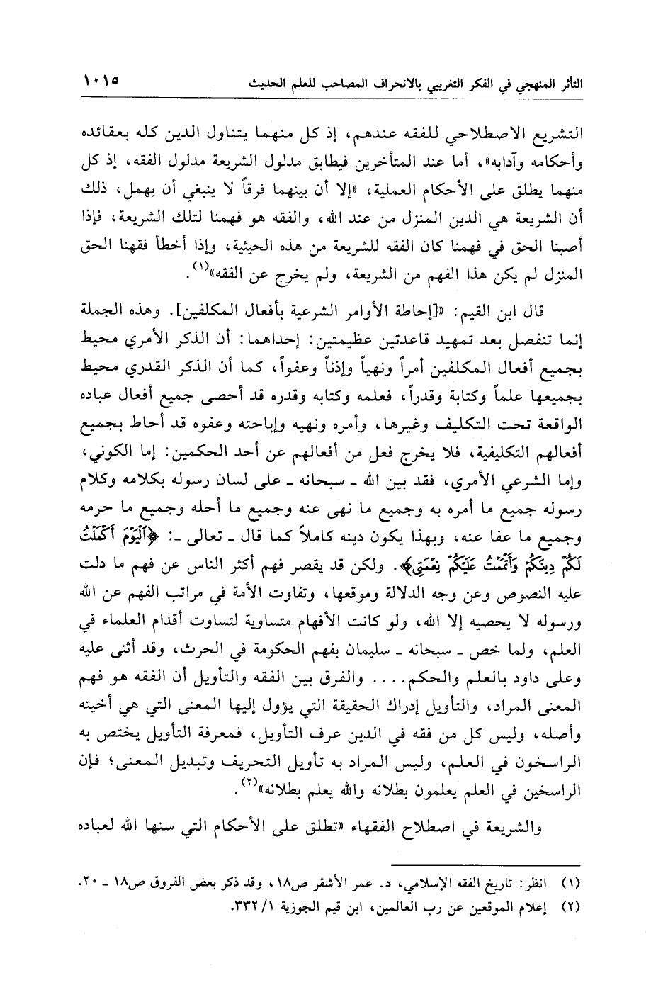 قال ابن القيم: " [إحاطة الأوامر الشرعية بأفعال المكلفين]. وهذه الجملة إنما تنفصل بعد تمهيد قاعدتين عظيمتين: إحداهما: أن الذكر الأمري محيط بجميع أفعال المكلفين أمرًا ونهيًا وإذنًا وعفوًا، كما أن الذكر القدري محيط بجميعها علمًا وكتابة وقدرًا، فعلمه وكتابه وقدره قد أحصى جميع أفعال عباده الواقعة تحت التكليف وغيرها، وأمره ونهيه وإباحته وعفوه قد أحاط بجميع أفعالهم التكليفية، فلا يخرج فعل من أفعالهم عن أحد الحكمين: إما الكوني، وإما الشرعي الأمري، فقد بين الله -سبحانه- على لسان رسوله بكلامه وكلام رسوله جميع ما أمره به وجميع ما نهى عنه وجميع ما أحله وجميع ما حرمه وجميع ما عفا عنه، وبهذا يكون دينه كاملًا كما قال -تعالى-: {الْيَوْمَ أَكْمَلْتُ لَكُمْ دِينَكُمْ وَأَتْمَمْتُ عَلَيْكُمْ نِعْمَتِي}. ولكن قد يقصر فهم أكثر الناس عن فهم ما دلت عليه النصوص وعن وجه الدلالة وموقعها، وتفاوت الأمة في مراتب الفهم عن الله ورسوله لا يحصيه إلا الله، ولو كانت الأفهام متساوية لتساوت أقدام العلماء في العلم، ولما خص -سبحانه- سليمان بفهم الحكومة في الحرث، وقد أثنى عليه وعلى داود بالعلم والحكم. . . . والفرق بين الفقه والتأويل أن الفقه هو فهم المعنى المراد، والتأويل إدراك الحقيقة التي يؤول إليها المعنى التي هي أخيته وأصله، وليس كل من فقه في الدين عرف التأويل، فمعرفة التأويل يختص به الراسخون في العلم، وليس المراد به تأويل التحريف وتبديل المعنى؛ فإن الراسخين في العلم يعلمون بطلانه والله يعلم بطلانه" (¬2).