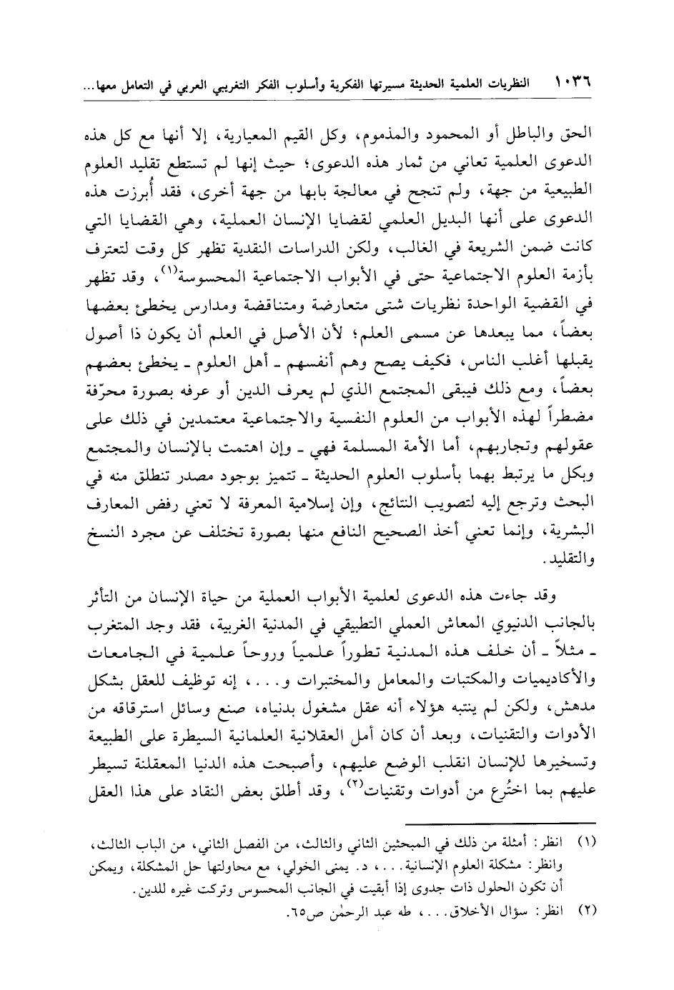 (¬1) انظر: أمثلة من ذلك في المبحثين الثاني والثالث، من الفصل الثاني، من الباب الثالث، وانظر: مشكلة العلوم الإنسانية. . . .، د. يمنى الخولي، مع محاولتها حل المشكلة، ويمكن أن تكون الحلول ذات جدوى إذا أبقيت في الجانب المحسوس وتركت غيره للدين.