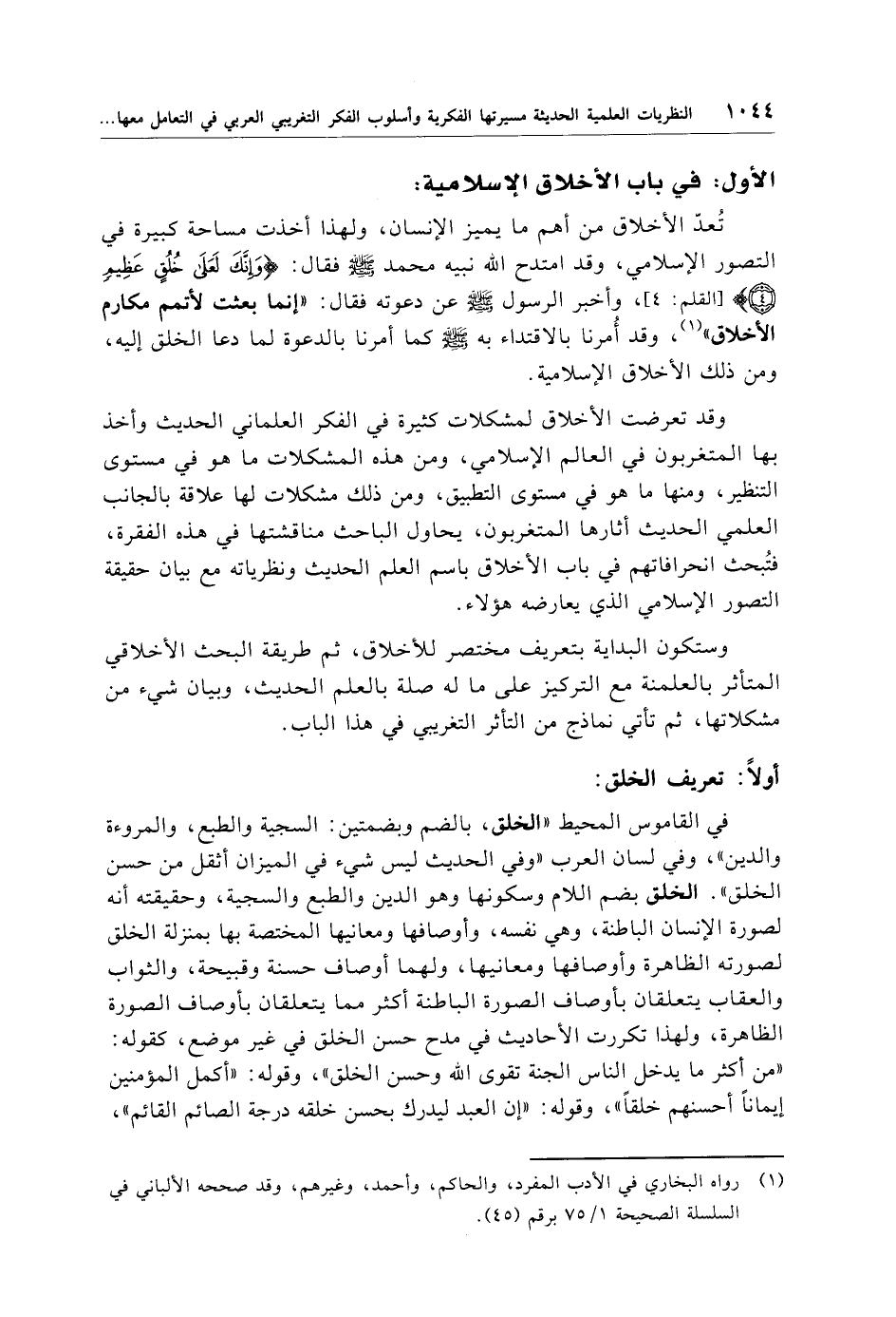 وستكون البداية بتعريف مختصر للأخلاق، ثم طريقة البحث الأخلاقي المتأثر بالعلمنة مع التركيز على ما له صلة بالعلم الحديث، وبيان شيء من مشكلاتها، ثم تأتي نماذج من التأثر التغريبي في هذا الباب.