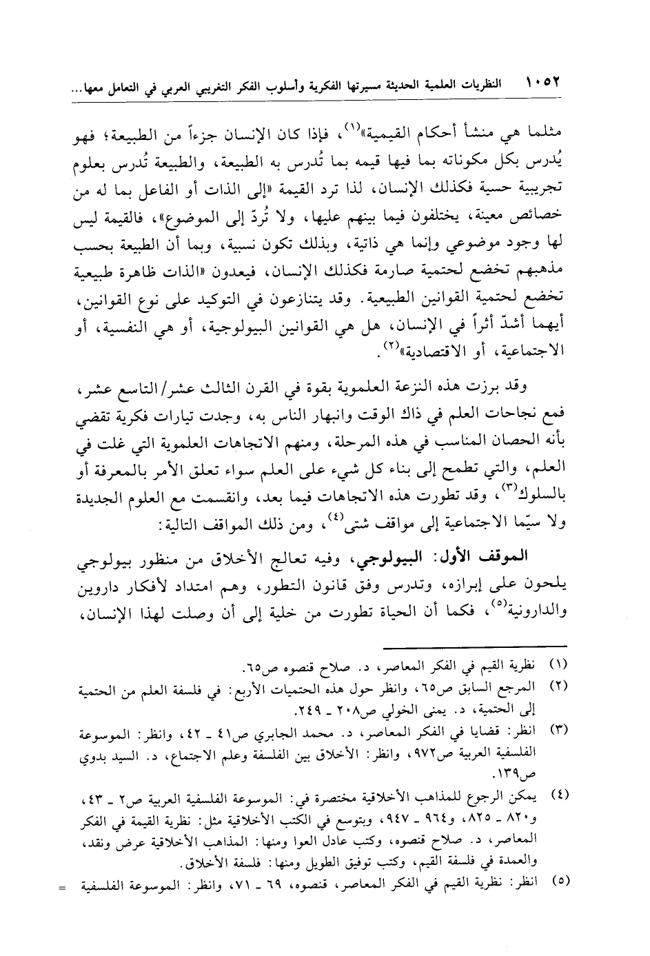 (¬3) انظر: قضايا في الفكر المعاصر، د. محمَّد الجابري ص 41 - 42، وانظر: الموسوعة الفلسفية العربية ص 972، وانظر: الأخلاق بين الفلسفة وعلم الاجتماع، د. السيد بدوي ص 139.