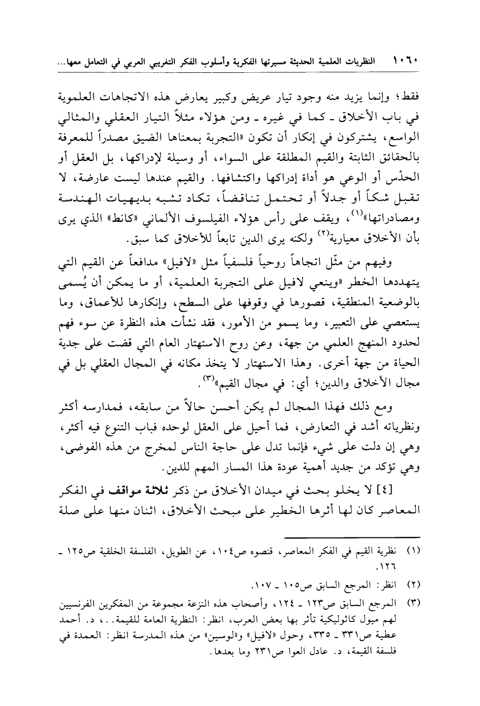 (¬3) المرجع السابق ص 123 - 124، وأصحاب هذه النزعة مجموعة من المفكرين الفرنسيين لهم ميول كاثوليكية تأثر بها بعض العرب، انظر: النظرية العامة للقيمة .. ، د. أحمد عطية ص 331 - 335، وحول "لافيل" و"لوسين" من هذه المدرسة انظر: العمدة في فلسفة القيمة، د. عادل العوا ص 231 وما بعدها.