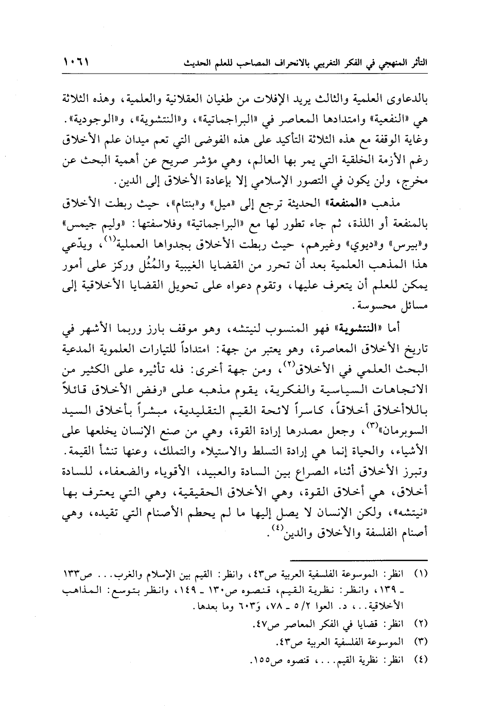 بالدعاوى العلمية والثالث يريد الإفلات من طغيان العقلانية والعلمية، وهذه الثلاثة هي "النفعية" وامتدادها المعاصر في "البراجماتية"، و"النتشوية"، و"الوجودية". وغاية الوقفة مع هذه الثلاثة التأكيد على هذه الفوضى التي تعم ميدان علم الأخلاق رغم الأزمة الخلقية التي يمر بها العالم، وهي مؤشر صريح عن أهمية البحث عن مخرج، ولن يكون في التصور الإِسلامي إلا بإعادة الأخلاق إلى الدين.