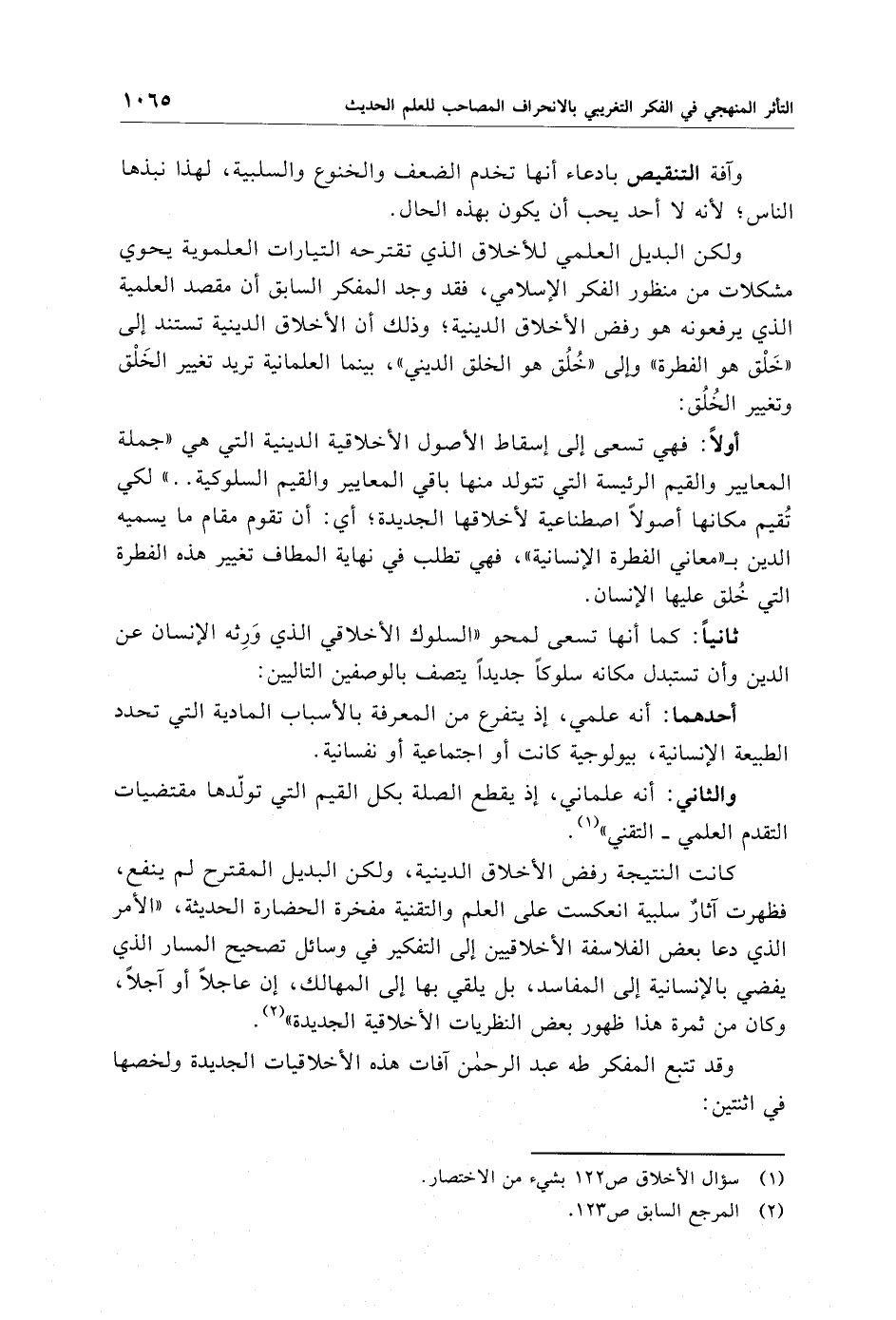 ولكن البديل العلمي للأخلاق الذي تقترحه التيارات العلموية يحوي مشكلات من منظور الفكر الإِسلامي، فقد وجد المفكر السابق أن مقصد العلمية الذي يرفعونه هو رفض الأخلاق الدينية، وذلك أن الأخلاق الدينية تستند إلى "خَلْق هو الفطرة" وإلى "خُلُق هو الخلق الديني"، بينما العلمانية تريد تغيير الخَلْق وتغيير الخُلُق: