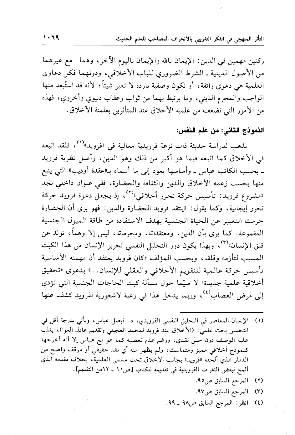 (¬1) الإنسان المعاصر في التحليل النفسي الفرويدي، د. فيصل عباس، ويأتي بدرجة أقل في التحمس بحث علمي: (الأخلاق عند فرويد لمحمد العجيلي وتقديم عادل العوا)، يغلب عليه الوصف دون حسّ نقدي، ورغم عدم تعصبه كما هو مع عباس إلا أنه أخرجها كنموذج أخلاقي مميز ومتماسك، ولم يظهر منه أي نقد حقيقي أو موقف واضح من الدمار الذي ألحقه "فرويد" بجانب الأخلاق تحت مسمى العلمية، بخلاف مقدمه الذي ألمح لبعض الثغرات الفرويدية في تقديمه للكتاب [ص 11 - 12 من التقديم].