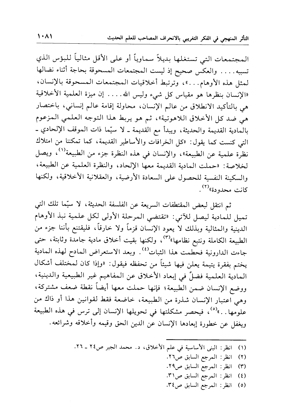 ثم انتقل لبعض المقتطفات السريعة عن الفلسفة الحديثة، لاسيّما تلك التي تميل للمادية ليصل للآتي: "تقتضي المرحلة الأولى لكل علمية نبذ الأوهام الدينية والمثالية وبذلك لا يعود الإنسان قزمًا ولا خارقًا، فليقتنع بأننا جزء من الطبيعة الكاملة ونتبع نظامها" (¬3)، ولكنها بقيت أخلاق مادية جامدة وثابتة، حتى جاءت الدارونية فحطمت هذا الثبات (¬4). وبعد الاستعراض المادح لهذه المادية يختم بفقرة يتيمة يعلن فيها شيئًا من تحفظه فيقول: "وإذا كان لمختلف أشكال المادية العلمية فضلٌ في إبعاد الأخلاق عن المفاهيم غير الطبيعية والدينية، ووضع الإنسان ضمن الطبيعة؛ فإنها حملت معها أيضًا نقطة ضعف مشتركة، وهي اعتبار الإنسان شذرة من الطبيعة، خاضعة فقط لقوانين هذا أو ذاك من علومها .. " (¬5)، فيحصر مشكلتها في تحويلها الإنسان إلى ترس في هذه الطبيعة ويغفل عن خطورة إبعادها الإنسان عن الدين الحق وقيمه وأخلاقه وشرائعه.