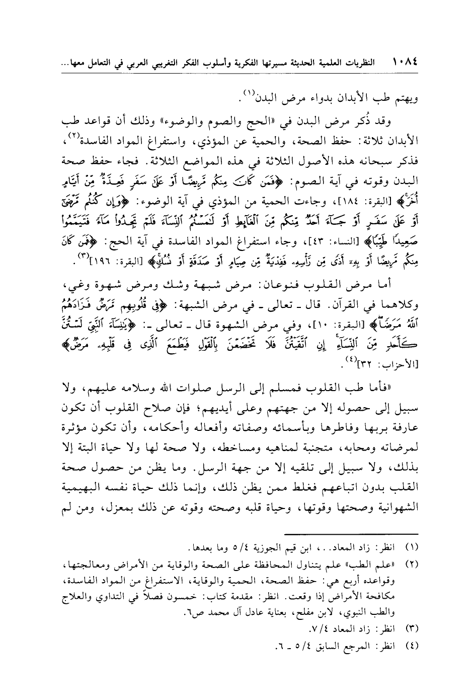 وقد ذُكر مرض البدن في "الحج والصوم والوضوء" وذلك أن قواعد طب الأبدان ثلاثة: حفظ الصحة، والحمية عن المؤذي، واستفراغ المواد الفاسدة (¬2)، فذكر سبحانه هذه الأصول الثلاثة في هذه المواضع الثلاثة. فجاء حفظ صحة البدن وقوته في آية الصوم: {فَمَنْ كَانَ مِنْكُمْ مَرِيضًا أَوْ عَلَى سَفَرٍ فَعِدَّةٌ مِنْ أَيَّامٍ أُخَرَ} [البقرة: 184]، وجاءت الحمية من المؤذي في آية الوضوء: {وَإِنْ كُنْتُمْ مَرْضَى أَوْ عَلَى سَفَرٍ أَوْ جَاءَ أَحَدٌ مِنْكُمْ مِنَ الْغَائِطِ أَوْ لَامَسْتُمُ النِّسَاءَ فَلَمْ تَجِدُوا مَاءً فَتَيَمَّمُوا صَعِيدًا طَيِّبًا} [النساء: 43]، وجاء استفراغ المواد الفاسدة في آية الحج: {فَمَنْ كَانَ مِنْكُمْ مَرِيضًا أَوْ بِهِ أَذًى مِنْ رَأْسِهِ فَفِدْيَةٌ مِنْ صِيَامٍ أَوْ صَدَقَةٍ أَوْ نُسُكٍ} [البقرة: 196] (¬3).