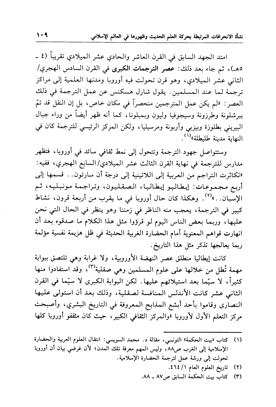 (¬1) كتاب "بيت الحكمة" التونسي، مقالة د. محمد السويسي: انتقال العلوم العربية والحضارة الإسلامية إلى الغرب ص 88، وليس المهم معرفة تلك المدن؛ لأن غرضي بيان أن أوروبا تحولت إلى ورشة عمل لترجمة الحضارة الإسلامية.