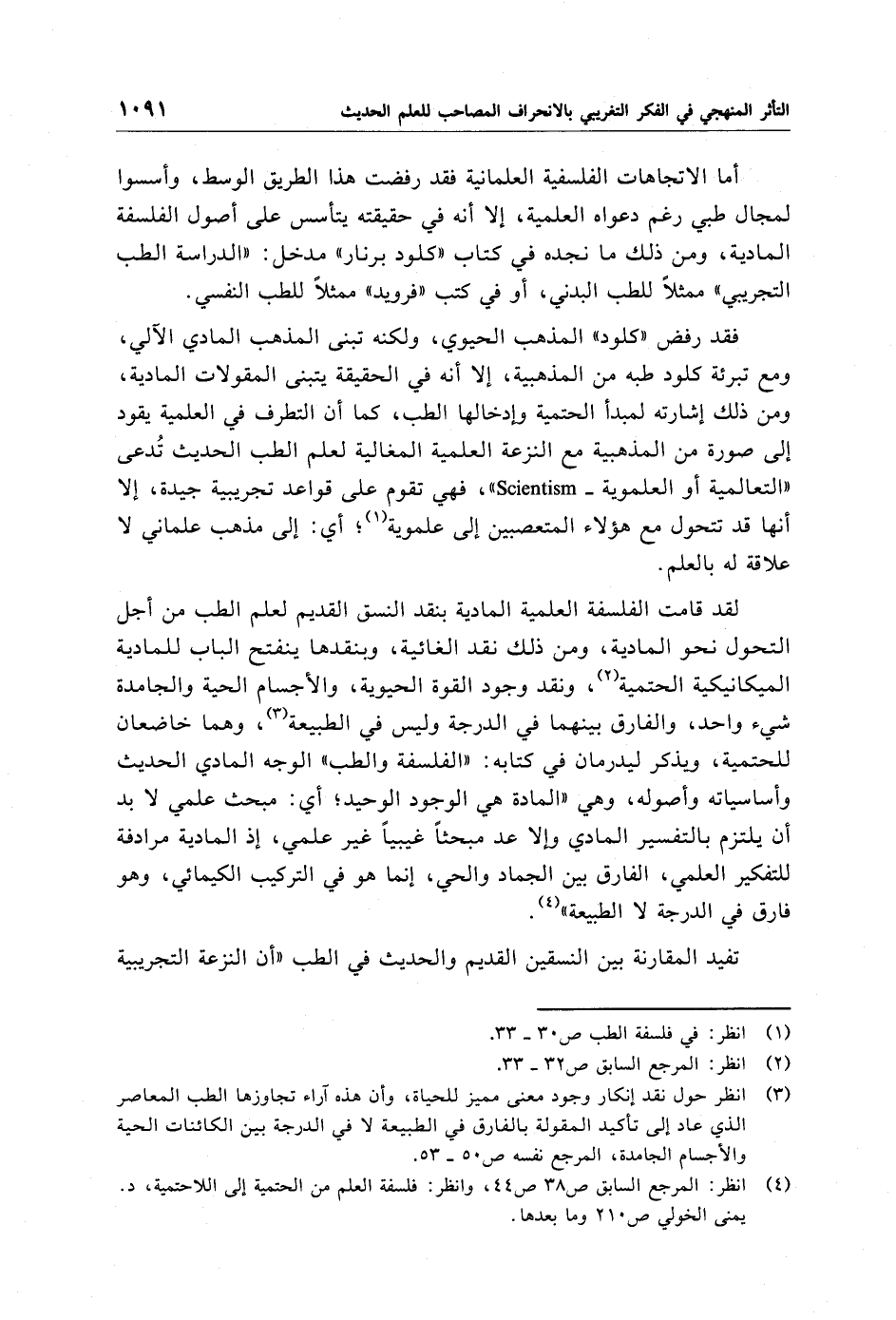 (¬3) انظر حول نقد إنكار وجود معنى مميز للحياة، وأن هذه آراء تجاوزها الطب المعاصر الذي عاد إلى تأكيد المقولة بالفارق في الطبيعة لا في الدرجة بين الكائنات الحية والأجسام الجامدة، المرجع نفسه ص 50 - 53.