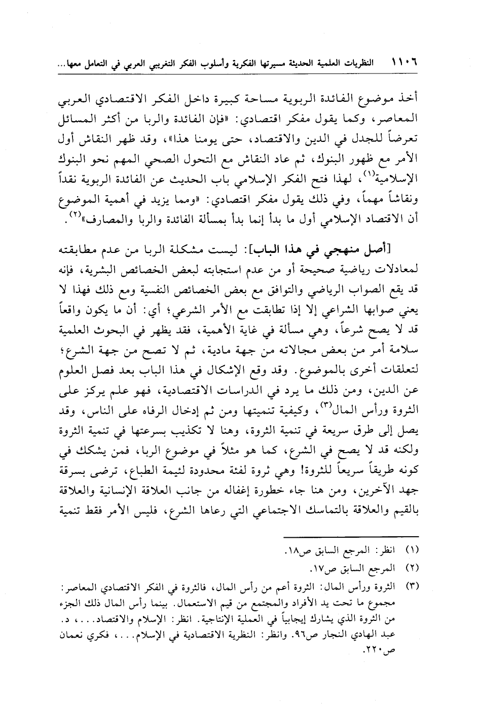 [أصل منهجي في هذا الباب]: ليست مشكلة الربا من عدم مطابقته لمعادلات رياضية صحيحة أو من عدم استجابته لبعض الخصائص البشرية، فإنه قد يقع الصواب الرياضي والتوافق مع بعض الخصائص النفسية ومع ذلك فهذا لا يعني صوابها الشراعي إلا إذا تطابقت مع الأمر الشرعي؛ أي: أن ما يكون واقعًا قد لا يصح شرعًا، وهي مسألة في غاية الأهمية، فقد يظهر في البحوث العلمية سلامة أمر من بعض مجالاته من جهة مادية، ثم لا تصح من جهة الشرع؛ لتعلقات أخرى بالموضوع. وقد وقع الإشكال في هذا الباب بعد فصل العلوم عن الدين، ومن ذلك ما يرد في الدراسات الاقتصادية، فهو علم يركز على الثروة ورأس المال (¬3)، وكيفية تنميتها ومن ثم إدخال الرفاه على الناس، وقد يصل إلى طرق سريعة في تنمية الثروة، وهنا لا تكذيب بسرعتها في تنمية الثروة ولكنه قد لا يصح في الشرع، كما هو مثلًا في موضوع الربا، فمن يشكك في كونه طريقًا سريعًا للثروة! وهي ثروة لفئة محدودة لئيمة الطباع، ترضى بسرقة جهد الآخرين، ومن هنا جاء خطورة إغفاله من جانب العلاقة الإنسانية والعلاقة بالقيم والعلاقة بالتماسك الاجتماعي التي رعاها الشرع، فليس الأمر فقط تنمية