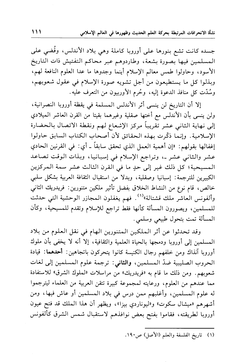 إلا أن التاريخ لن ينسى أثر الأندلس المسلمة في يقظة أوروبا النصرانية، ولن ينسى بأن الأندلس مع أختها صقلية وغيرهما بقيتا من القرن العاشر الميلادي إلى نهاية الثاني عشر تقريبًا مركز الإشعاع لهم ونقطة الاتصال بالحضارة الإسلامية. وإنما ذكّرت بهذه الحقائق لأن أصحاب الكتاب السابق حاولوا إغفالها بقولهم: "إن أهمية العمل الذي تحقق سابقًا -أي: في القرنين الحادي عشر والثاني عشر-، وتراجع الإسلام في إسبانيا، وبذات الوقت تصاعد المسيحية؛ كل ذلك غير إلى حدٍ ما في القرن الثالث عشر سمة المركزين الكبيرين للترجمة: إسبانيا وصقلية، وبدلا من استقبال الثقافة العربية بشكل سلبي خالص، قام نوع من النشاط الخلاق بفضل تأثير ملكين متنورين: فريدريك الثاني وألفونس العاشر ملك قشتالة" (¬1). فهم يغفلون المجازر الوحشية التي حدثت للمسلمين، ويصورون المسألة كأنها فقط تراجع للإسلام وتقدم للمسيحية، وكأن المسألة تمت بتحول طبيعي وسلمي.
