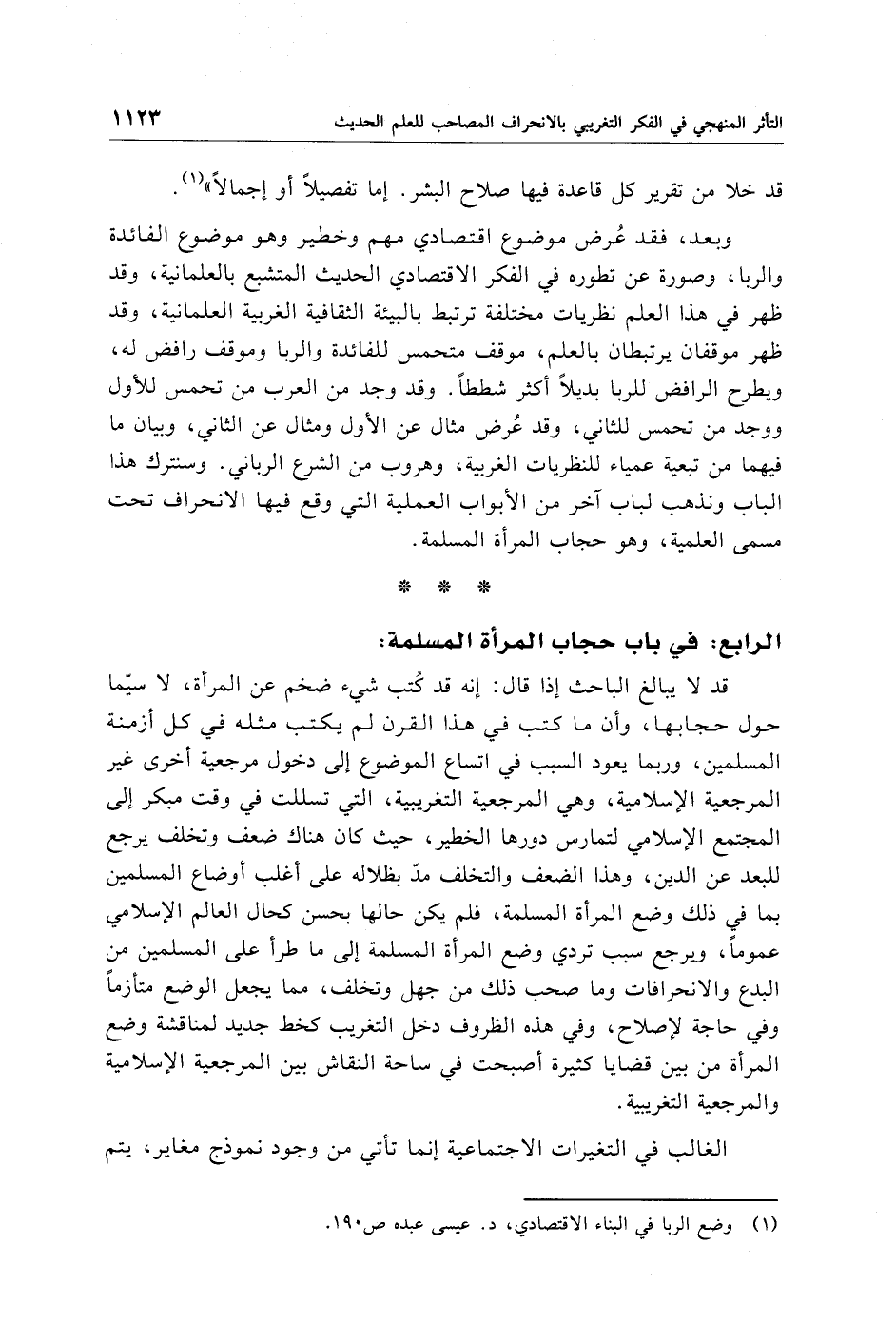 وبعد، فقد عُرض موضوع اقتصادي مهم وخطير وهو موضوع الفائدة والربا، وصورة عن تطوره في الفكر الاقتصادي الحديث المتشبع بالعلمانية، وقد ظهر في هذا العلم نظريات مختلفة ترتبط بالبيئة الثقافية الغربية العلمانية، وقد ظهر موقفان يرتبطان بالعلم، موقف متحمس للفائدة والربا وموقف رافض له، ويطرح الرافض للربا بديلًا أكثر شططًا. وقد وجد من العرب من تحمس للأول ووجد من تحمس للثاني، وقد عُرض مثال عن الأول ومثال عن الثاني، وبيان ما فيهما من تبعية عمياء للنظريات الغربية، وهروب من الشرع الرباني. وسنترك هذا الباب ونذهب لباب آخر من الأبواب العملية التي وقع فيها الانحراف تحت مسمى العلمية، وهو حجاب المرأة المسلمة.