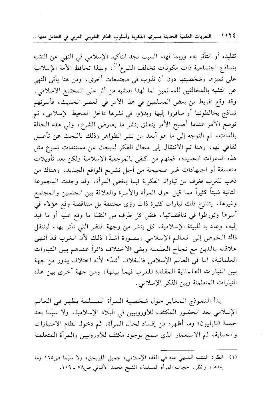 (¬1) انظر: التشبه المنهي عنه في الفقه الإسلامي، جميل اللويحق، ولاسيّما ص 165 وما بعدها، وانظر: حجاب المرأة المسلمة، الشيخ محمد الألباني ص 78 - 109.