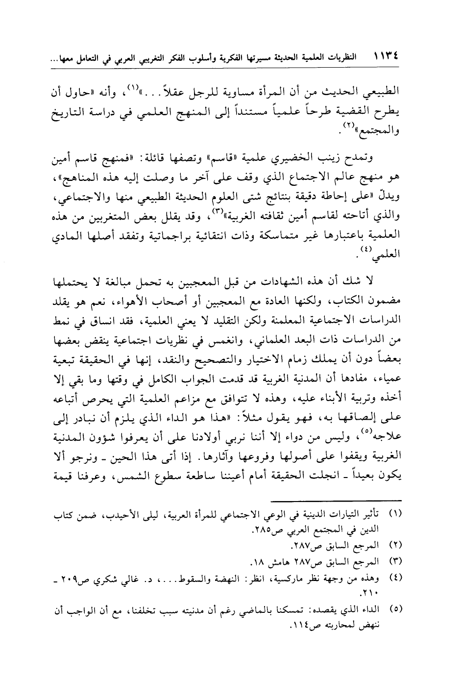الطبيعي الحديث من أن المرأة مساوية للرجل عقلًا. . . ." (¬1)، وأنه "حاول أن يطرح القضية طرحًا علميًا مستندًا إلى المنهج العلمي في دراسة التاريخ والمجتمع" (¬2).