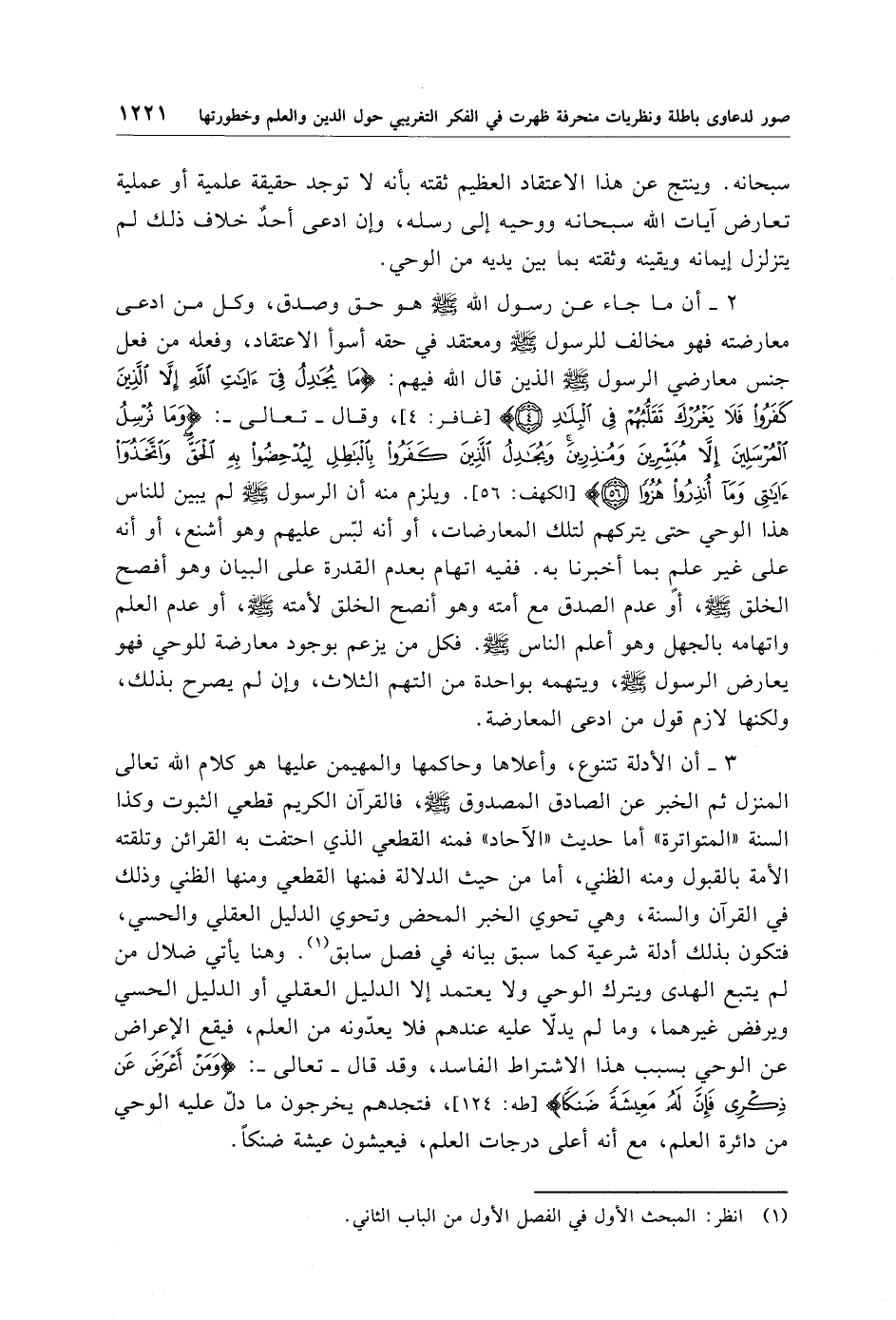 2 - أن ما جاء عن رسول الله - صلى الله عليه وسلم - هو حق وصدق، وكل من ادعى معارضته فهو مخالف للرسول - صلى الله عليه وسلم - ومعتقد في حقه أسوأ الاعتقاد، وفعله من فعل جنس معارضي الرسول - صلى الله عليه وسلم - الذين قال الله فيهم: {مَا يُجَادِلُ في آيَاتِ اللهِ إِلَّا الَّذِينَ كَفَرُوا فَلَا يَغْرُرْكَ تَقَلُّبُهُمْ في الْبِلَادِ (4)} [غافر: 4]، وقال -تعالى-: {وَمَا نُرْسِلُ الْمُرْسَلِينَ إِلَّا مُبَشِّرِينَ وَمُنْذِرِينَ وَيُجَادِلُ الَّذِينَ كَفَرُوا بِالْبَاطِلِ لِيُدْحِضُوا بِهِ الْحَقَّ وَاتَّخَذُوا آيَاتِي وَمَا أُنْذِرُوا هُزُوَا (56)} [الكهف: 56]. ويلزم منه أن الرسول - صلى الله عليه وسلم - لم يبين للناس هذا الوحي حتى يتركهم لتلك المعارضات، أو أنه لبّس عليهم وهو أشنع، أو أنه على غير علمٍ بما أخبرنا به. ففيه اتهام بعدم القدرة على البيان وهو أفصح الخلق - صلى الله عليه وسلم -، أو عدم الصدق مع أمته وهو أنصح الخلق لأمته - صلى الله عليه وسلم -، أو عدم العلم واتهامه بالجهل وهو أعلم الناس - صلى الله عليه وسلم -. فكل من يزعم بوجود معارضة للوحي فهو يعارض الرسول - صلى الله عليه وسلم -، ويتهمه بواحدة من التهم الثلاث، وإن لم يصرح بذلك، ولكنها لازم قول من ادعى المعارضة.