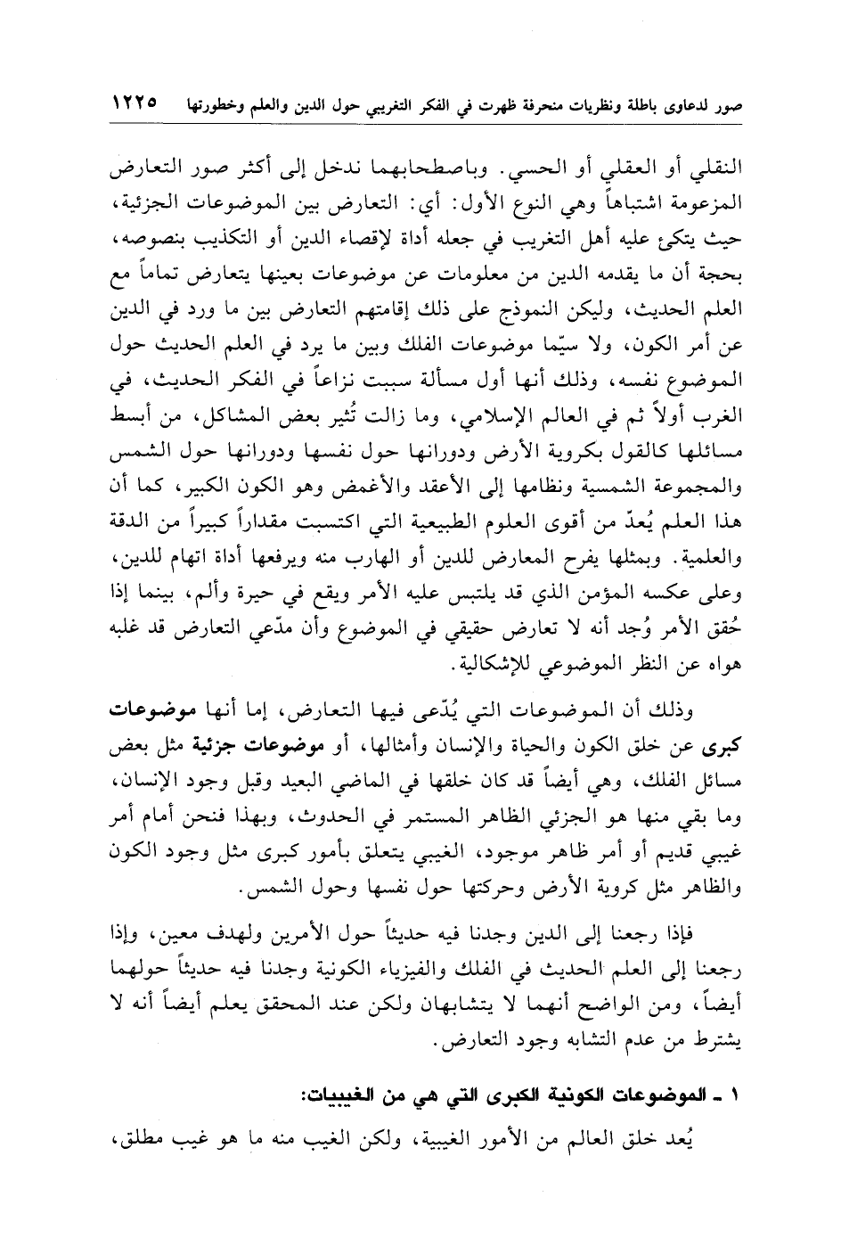 النقلي أو العقلي أو الحسي. وباصطحابهما ندخل إلى أكثر صور التعارض المزعومة اشتباهًا وهي النوع الأول: أي: التعارض بين الموضوعات الجزئية، حيث يتكئ عليه أهل التغريب في جعله أداة لإقصاء الدين أو التكذيب بنصوصه، بحجة أن ما يقدمه الدين من معلومات عن موضوعات بعينها يتعارض تمامًا مع العلم الحديث، وليكن النموذج على ذلك إقامتهم التعارض بين ما ورد في الدين عن أمر الكون، ولاسيّما موضوعات الفلك وبين ما يرد في العلم الحديث حول الموضوع نفسه، وذلك أنها أول مسألة سببت نزاعًا في الفكر الحديث، في الغرب أولًا ثم في العالم الإسلامي، وما زالت تُثير بعض المشاكل، من أبسط مسائلها كالقول بكروية الأرض ودورانها حول نفسها ودورانها حول الشمس والمجموعة الشمسية ونظامها إلى الأعقد والأغمض وهو الكون الكبير، كما أن هذا العلم يُعدّ من أقوى العلوم الطبيعية التي اكتسبت مقدارًا كبيرًا من الدقة والعلمية. وبمثلها يفرح المعارض للدين أو الهارب منه ويرفعها أداة اتهام للدين، وعلى عكسه المؤمن الذي قد يلتبس عليه الأمر ويقع في حيرة وألم، بينما إذا حُقق الأمر وُجد أنه لا تعارض حقيقي في الموضوع وأن مدّعي التعارض قد غلبه هواه عن النظر الموضوعي للإشكالية.