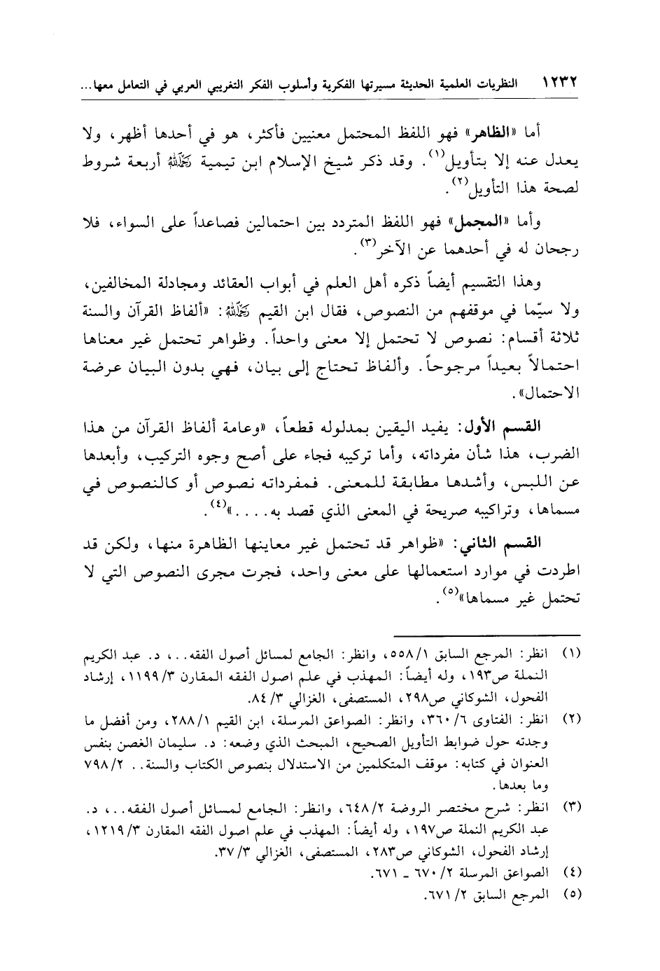 (¬2) انظر: الفتاوى 6/ 360، وانظر: الصواعق المرسلة، ابن القيم 1/ 288، ومن أفضل ما وجدته حول ضوابط التأويل الصحيح، المبحث الذي وضعه: د. سليمان الغصن بنفس العنوان في كتابه: موقف المتكلمين من الاستدلال بنصوص الكتاب والسنة .. 2/ 798 وما بعدها.
