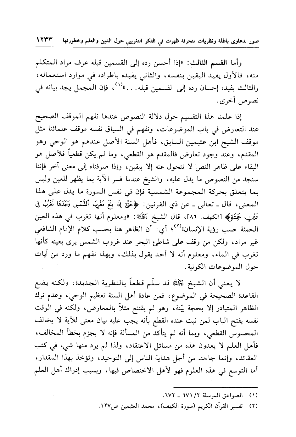 إذا علمنا هذا التقسيم حول دلالة النصوص عندها نفهم الموقف الصحيح عند التعارض في باب الموضوعات، ونفهم في السياق نفسه موقف علمائنا مثل موقف الشيخ ابن عثيمين السابق، فأهل السنة الأصل عندهم هو الوحي وهو المقدم، وعند وجود تعارض فالمقدم هو القطعي، وما لم يكن قطعيًا فالأصل هو البقاء على ظاهر النص لا نتحول عنه إلا بيقين، وإذا صرفناه إلى معنى آخر فإننا سنجد من النصوص ما يدل عليه، والشيخ عندما فسر الآية بما يظهر للعين وليس بما يتعلق بحركة المجموعة الشمسية فإن في نفس السورة ما يدل على هذا المعنى، قال -تعالى- عن ذي القرنين: {حَتَّى إِذَا بَلَغَ مَغْرِبَ الشَّمْسِ وَجَدَهَا تَغْرُبُ في عَيْنٍ حَمِئَةٍ} [الكهف: 86]، قال الشيخ -رحمه الله-: "ومعلوم أنها تغرب في هذه العين الحمئة حسب رؤية الإنسان" (¬2)؛ أي: أن الظاهر هنا بحسب كلام الإِمام الشافعي غير مراد، ولكن من وقف على شاطئ البحر عند غروب الشمس يرى بعينه كأنها تغرب في الماء، ومعلوم أنه لا أحد يقول بذلك، وبهذا نفهم ما ورد من آيات حول الموضوعات الكونية.