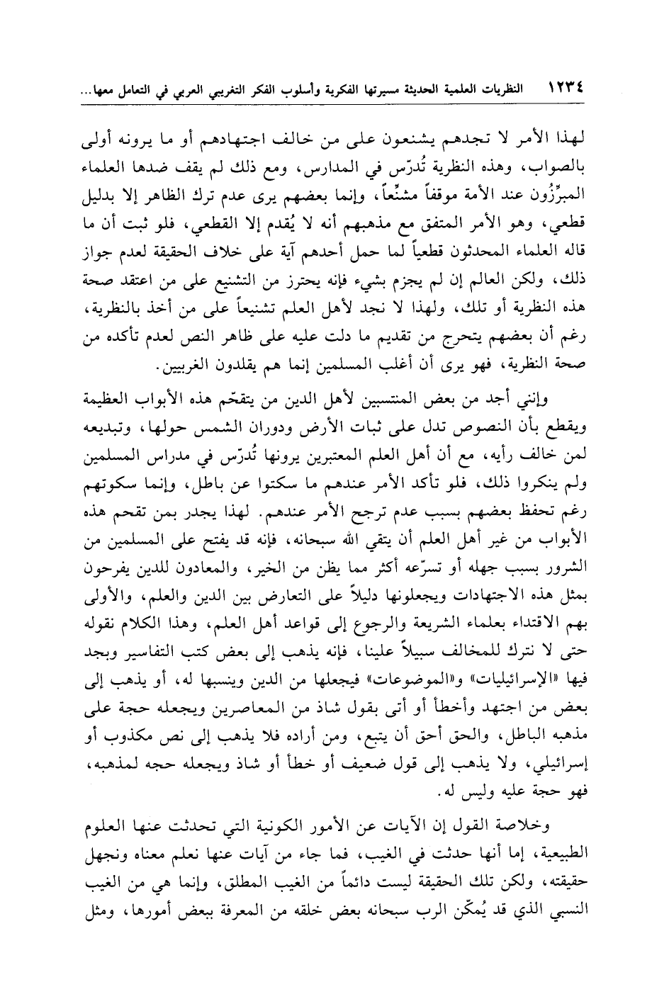 لهذا الأمر لا تجدهم يشنعون على من خالف اجتهادهم أو ما يرونه أولى بالصواب، وهذه النظرية تُدرّس في المدارس، ومع ذلك لم يقف ضدها العلماء المبرِّزُون عند الأمة موقفًا مشنِّعًا، وإنما بعضهم يرى عدم ترك الظاهر إلا بدليل قطعي، وهو الأمر المتفق مع مذهبهم أنه لا يُقدم إلا القطعي، فلو ثبت أن ما قاله العلماء المحدثون قطعيًا لما حمل أحدهم آية على خلاف الحقيقة لعدم جواز ذلك، ولكن العالم إن لم يجزم بشيء فإنه يحترز من التشنيع على من اعتقد صحة هذه النظرية أو تلك، ولهذا لا نجد لأهل العلم تشنيعًا على من أخذ بالنظرية، رغم أن بعضهم يتحرج من تقديم ما دلت عليه على ظاهر النص لعدم تأكده من صحة النظرية، فهو يرى أن أغلب المسلمين إنما هم يقلدون الغربيين.