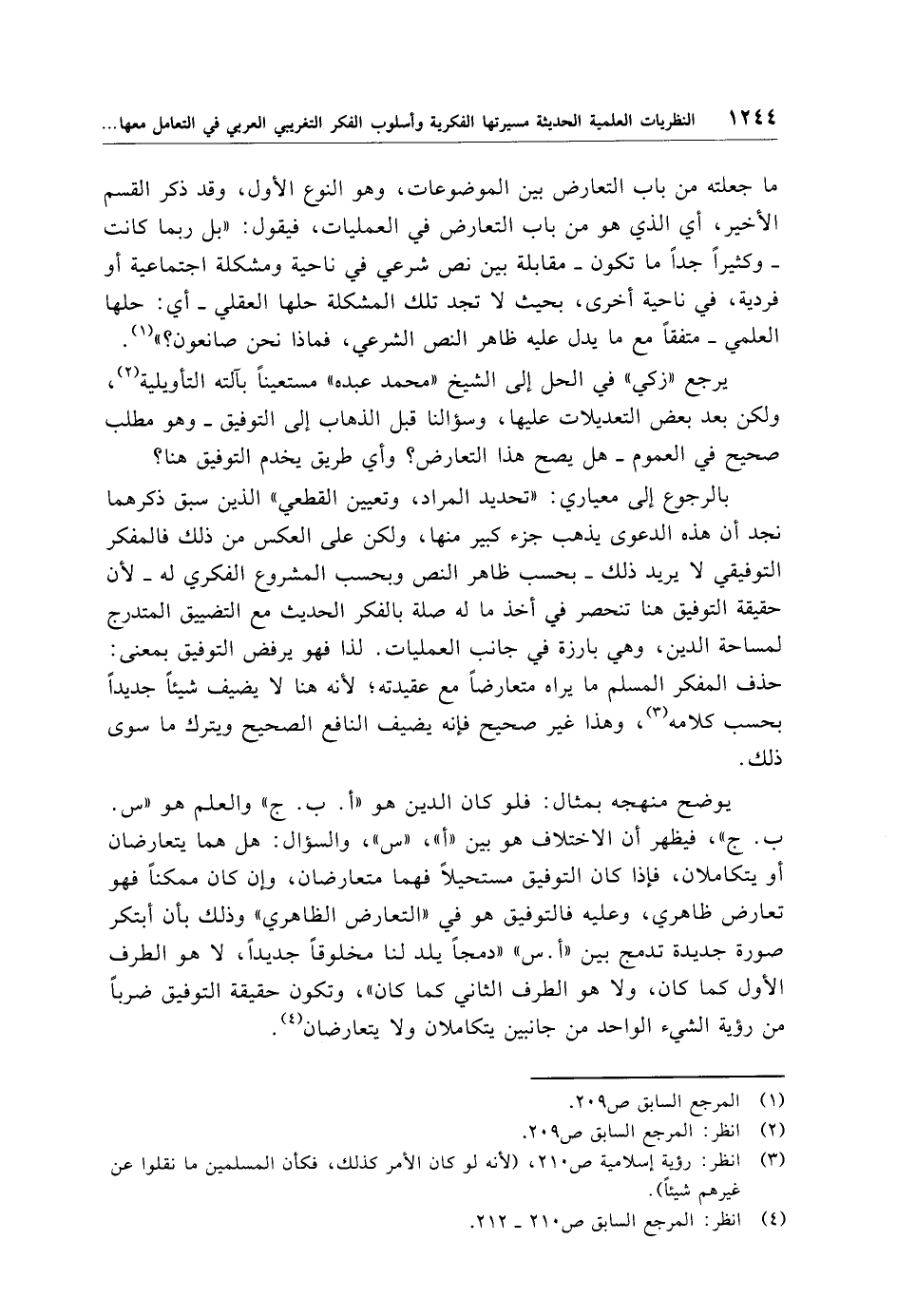 بالرجوع إلى معياري: "تحديد المراد، وتعيين القطعي" الذين سبق ذكرهما نجد أن هذه الدعوى يذهب جزء كبير منها، ولكن على العكس من ذلك فالمفكر التوفيقي لا يريد ذلك -بحسب ظاهر النص وبحسب المشروع الفكري له- لأن حقيقة التوفيق هنا تنحصر في أخذ ما له صلة بالفكر الحديث مع التضييق المتدرج لمساحة الدين، وهي بارزة في جانب العمليات. لذا فهو يرفض التوفيق بمعنى: حذف المفكر المسلم ما يراه متعارضًا مع عقيدته؛ لأنه هنا لا يضيف شيئًا جديدًا بحسب كلامه (¬3)، وهذا غير صحيح فإنه يضيف النافع الصحيح ويترك ما سوى ذلك.