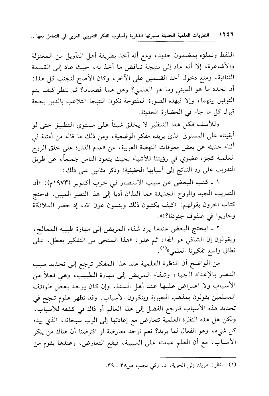 من الواضح أن النظرة العلمية عند هذا المفكر ترجع إلى تحديد سبب النصر بالإعداد الجيد، وشفاء المريض إلى مهارة الطبيب، وهي فعلًا من الأسباب ولا اعتراض عليها عند أهل السنة، وإن كان يوجد بعض طوائف المسلمين يقولون بمذهب الجبرية وينكرون الأسباب. وقد تظهر علوم تنجح في تحديد هذه الأسباب فنرجع الفضل إلى هذا العالم أو ذاك في كشفه للأسباب، ولكن هل هذه النظرة العلمية تتعارض مع إعادتها إلى الرب سبحانه، الذي بيده كل شيء، وهو الفعال لما يريد؟ نعم توجد معارضة لو افترضنا أن هناك من ينكر الأسباب، مع أن العلم عمدته على السببية، فيقع التعارض، وعندها يقوم من