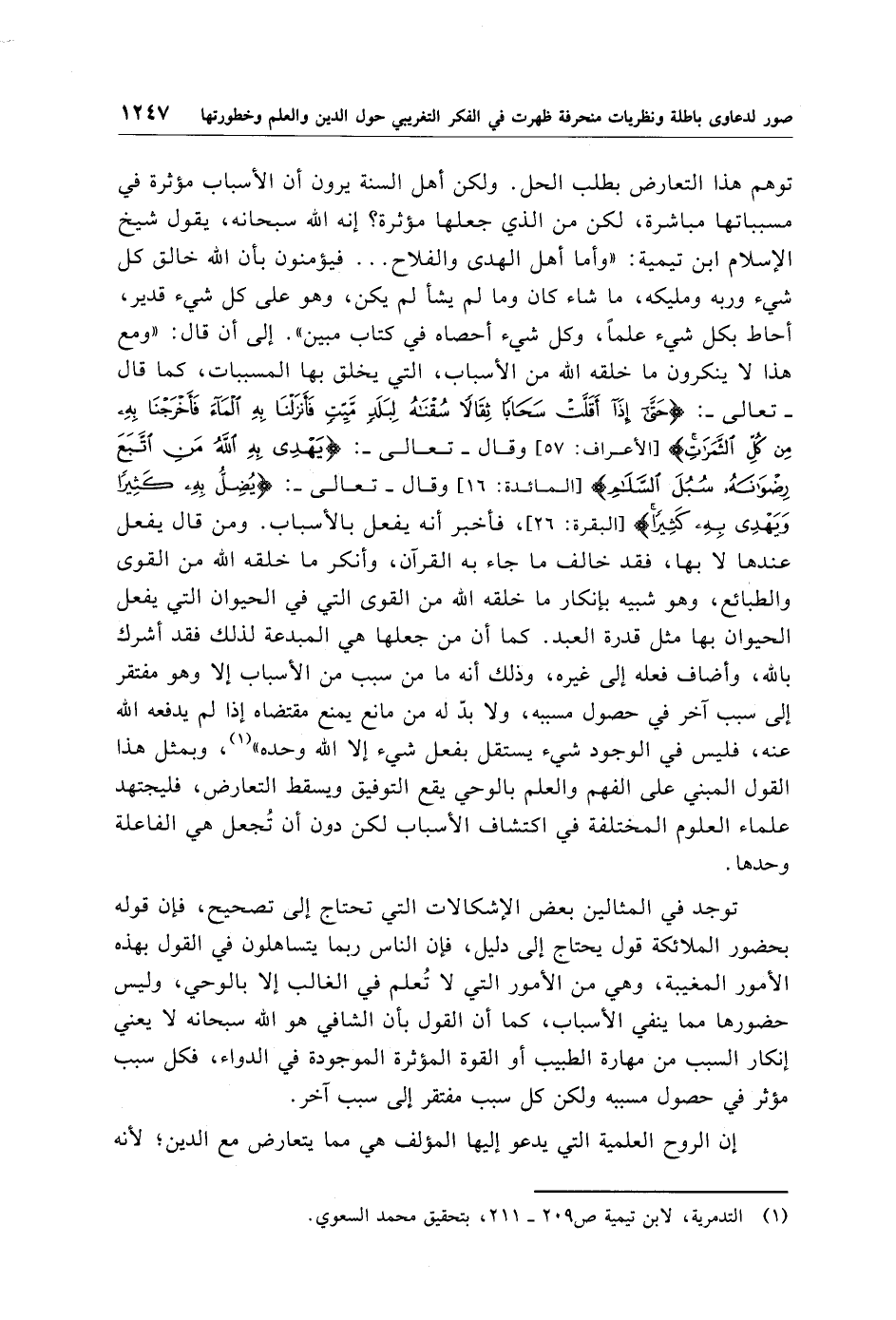 توهم هذا التعارض بطلب الحل. ولكن أهل السنة يرون أن الأسباب مؤثرة في مسبباتها مباشرة، لكن من الذي جعلها مؤثرة؟ إنه الله سبحانه، يقول شيخ الإسلام ابن تيمية: "وأما أهل الهدى والفلاح. . . . فيؤمنون بأن الله خالق كل شيء وربه ومليكه، ما شاء كان وما لم يشأ لم يكن، وهو على كل شيء قدير، أحاط بكل شيء علمًا، وكل شيء أحصاه في كتاب مبين". إلى أن قال: "ومع هذا لا ينكرون ما خلقه الله من الأسباب، التي يخلق بها المسببات، كما قال -تعالى-: {حَتَّى إِذَا أَقَلَّتْ سَحَابًا ثِقَالًا سُقْنَاهُ لِبَلَدٍ مَيِّتٍ فَأَنْزَلْنَا بِهِ الْمَاءَ فَأَخْرَجْنَا بِهِ مِنْ كُلِّ الثَّمَرَاتِ} [الأعراف: 57] وقال -تعالى-: {يَهْدِي بِهِ الله مَنِ اتَّبَعَ رِضْوَانَهُ سُبُلَ السَّلَامِ} [المائدة: 16] وقال -تعالى-: {يُضِلُّ بِهِ كَثِيرًا وَيَهْدِي بِهِ كَثِيرًا} [البقرة: 26]، فأخبر أنه يفعل بالأسباب. ومن قال يفعل عندها لا بها، فقد خالف ما جاء به القرآن، وأنكر ما خلقه الله من القوى والطبائع، وهو شبيه بإنكار ما خلقه الله من القوى التي في الحيوان التي يفعل الحيوان بها مثل قدرة العبد. كما أن من جعلها هي المبدعة لذلك فقد أشرك بالله، وأضاف فعله إلى غيره، وذلك أنه ما من سبب من الأسباب إلا وهو مفتقر إلى سبب آخر في حصول مسببه، ولابدّ له من مانع يمنع مقتضاه إذا لم يدفعه الله عنه، فليس في الوجود شيء يستقل بفعل شيء إلا الله وحده" (¬1)، وبمثل هذا القول المبني على الفهم والعلم بالوحي يقع التوفيق ويسقط التعارض، فليجتهد علماء العلوم المختلفة في اكتشاف الأسباب لكن دون أن تُجعل هي الفاعلة وحدها.