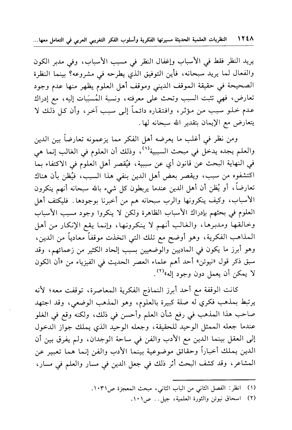 ومن نظر في أغلب ما يعرضه أهل الفكر مما يزعمونه تعارضًا بين الدين والعلم يجده يدخل في مبحث السببية (¬1)، وذلك أن العلوم في الغالب إنما هي في النهاية البحث عن قانون أي عن سببية، فيُقصر أهل العلوم في الاكتفاء بما اكتشفوه من سبب، ويقصر بعض أهل الدين بنفي هذا السبب، فيُظن بأن هناك تعارضًا، أو يُظن أن أهل الدين عندما يربطون كل شيء بالله سبحانه أنهم ينكرون الأسباب، وكيف ينكرونها والرب سبحانه هم من أخبرنا بوجودها. فليكتف أهل العلوم في بحثهم بإدراك الأسباب الظاهرة ولكن لا ينكروا وجود مسبب الأسباب وخالقها ومدبرها، والغالب أنهم لا ينكرونها، وإنما يقع الإنكار من أهل المذاهب الفكرية، وهو أوضح مع تلك التي اتخذت موقفًا معاديًا من الدين، وهو أبرز ما يكون في الماديين والوضعيين بسبب إلحاد الكثير من زعمائهم، وقد سبق ذكر قول "نيوتن" أحد أهم علماء العصر الحديث في الفيزياء من "أن الكون لا يمكن أن يعمل دون وجود إله" (¬2).