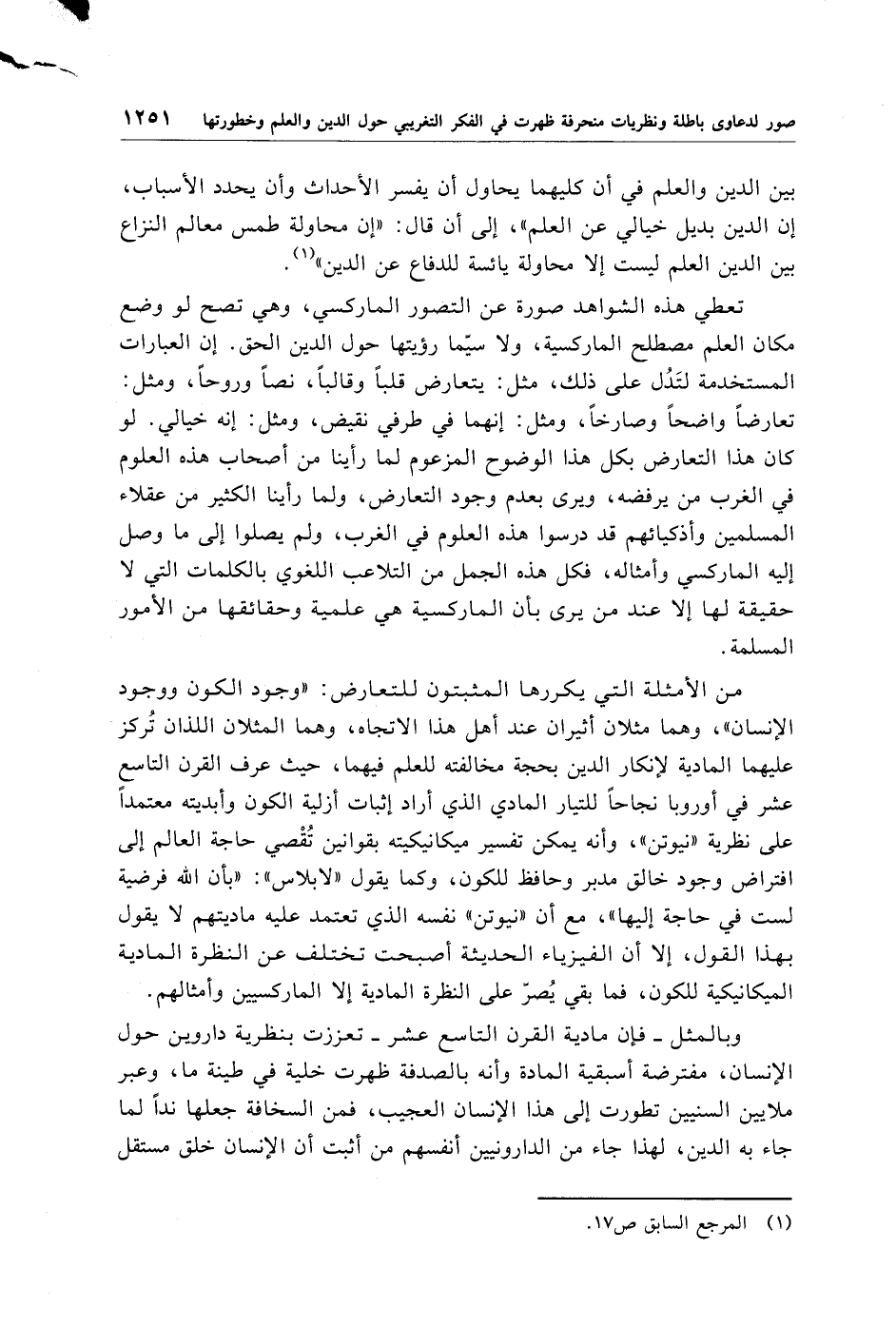 تعطي هذه الشواهد صورة عن التصور الماركسي، وهي تصح لو وضع مكان العلم مصطلح الماركسية، ولاسيّما رؤيتها حول الدين الحق. إن العبارات المستخدمة لتَدُل على ذلك، مثل: يتعارض قلبًا وقالبًا، نصًا وروحًا، ومثل: تعارضًا واضحًا وصارخًا، ومثل: إنهما في طرفي نقيض، ومثل: إنه خيالي. لو كان هذا التعارض بكل هذا الوضوح المزعوم لما رأينا من أصحاب هذه العلوم في الغرب من يرفضه، ويرى بعدم وجود التعارض، ولما رأينا الكثير من عقلاء المسلمين وأذكيائهم قد درسوا هذه العلوم في الغرب، ولم يصلوا إلى ما وصل إليه الماركسي وأمثاله، فكل هذه الجمل من التلاعب اللغوي بالكلمات التي لا حقيقة لها إلا عند من يرى بأن الماركسية هي علمية وحقائقها من الأمور المسلمة.
