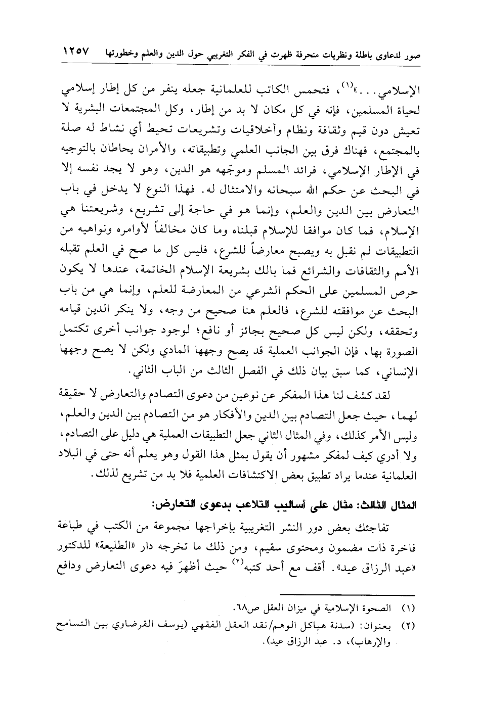 تفاجئك بعض دور النشر التغريبية بإخراجها مجموعة من الكتب في طباعة فاخرة ذات مضمون ومحتوى سقيم، ومن ذلك ما تخرجه دار "الطليعة" للدكتور "عبد الرزاق عيد". أقف مع أحد كتبه (¬2) حيث أظهرَ فيه دعوى التعارض ودافع