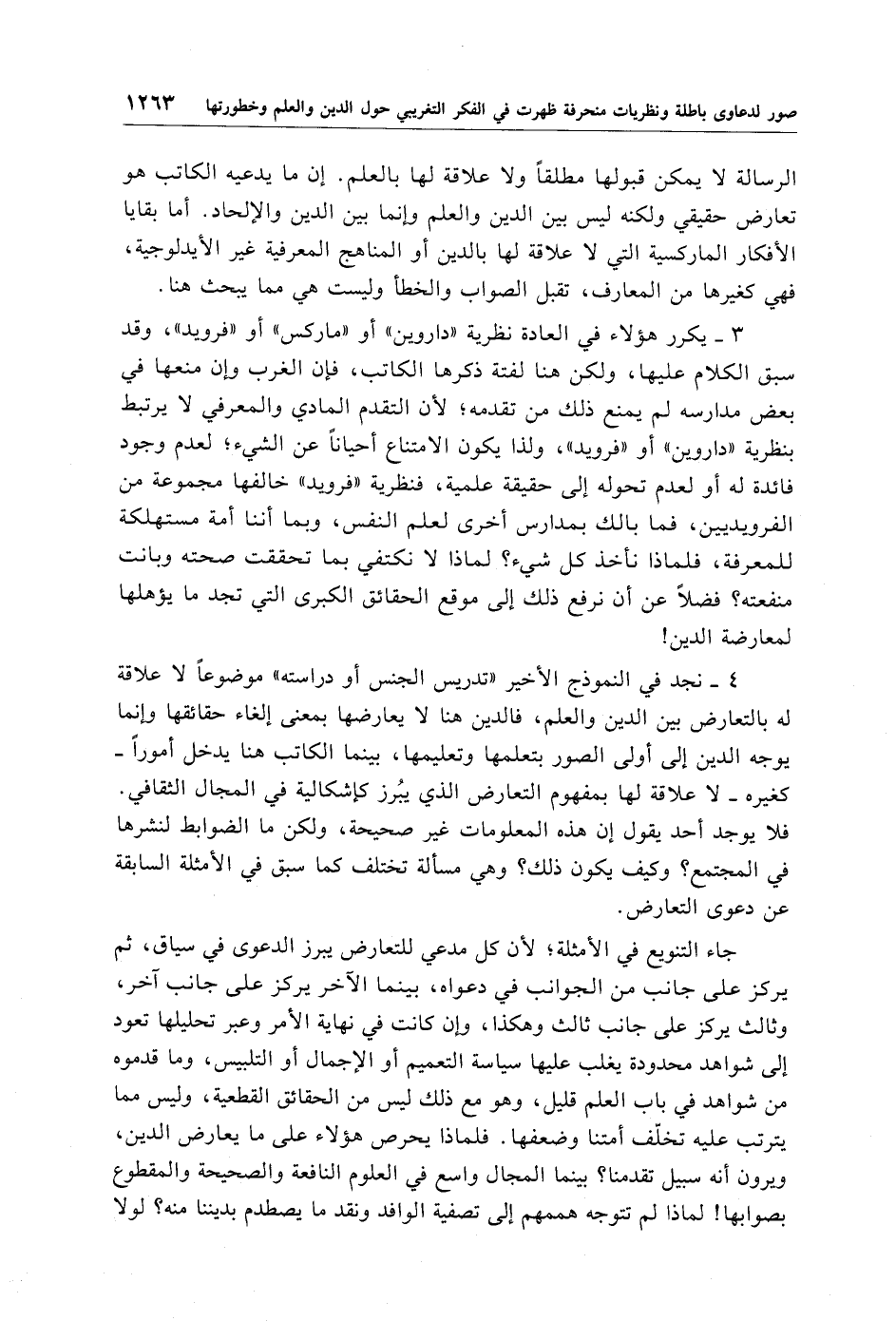 4 - نجد في النموذج الأخير "تدريس الجنس أو دراسته" موضوعًا لا علاقة له بالتعارض بين الدين والعلم، فالدين هنا لا يعارضها بمعنى إلغاء حقائقها وإنما يوجه الدين إلى أولى الصور بتعلمها وتعليمها، بينما الكاتب هنا يدخل أمورًا -كغيره- لا علاقة لها بمفهوم التعارض الذي يُبرز كإشكالية في المجال الثقافي. فلا يوجد أحد يقول إن هذه المعلومات غير صحيحة، ولكن ما الضوابط لنشرها في المجتمع؟ وكيف يكون ذلك؟ وهي مسألة تختلف كما سبق في الأمثلة السابقة عن دعوى التعارض.