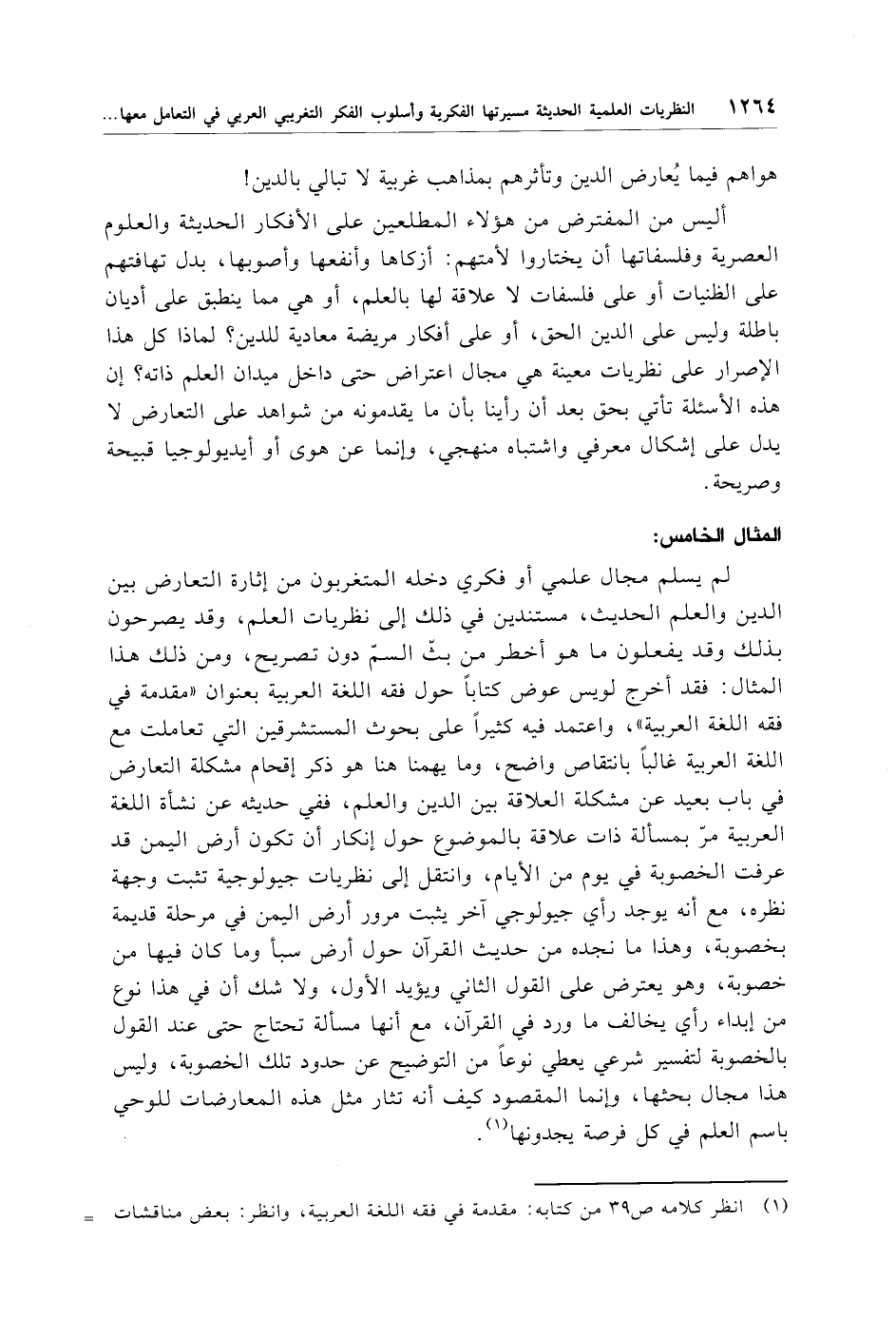 لم يسلم مجال علمي أو فكري دخله المتغربون من إثارة التعارض بين الدين والعلم الحديث، مستندين في ذلك إلى نظريات العلم، وقد يصرحون بذلك وقد يفعلون ما هو أخطر من بثّ السمّ دون تصريح، ومن ذلك هذا المثال: فقد أخرج لويس عوض كتابًا حول فقه اللغة العربية بعنوان "مقدمة في فقه اللغة العربية"، واعتمد فيه كثيرًا على بحوث المستشرقين التي تعاملت مع اللغة العربية غالبًا بانتقاص واضح، وما يهمنا هنا هو ذكر إقحام مشكلة التعارض في باب بعيد عن مشكلة العلاقة بين الدين والعلم، ففي حديثه عن نشأة اللغة العربية مرّ بمسألة ذات علاقة بالموضوع حول إنكار أن تكون أرض اليمن قد عرفت الخصوبة في يوم من الأيام، وانتقل إلى نظريات جيولوجية تثبت وجهة نظره، مع أنه يوجد رأي جيولوجي آخر يثبت مرور أرض اليمن في مرحلة قديمة بخصوبة، وهذا ما نجده من حديث القرآن حول أرض سبأ وما كان فيها من خصوبة، وهو يعترض على القول الثاني ويؤيد الأول، ولا شك أن في هذا نوع من إبداء رأي يخالف ما ورد في القرآن، مع أنها مسألة تحتاج حتى عند القول بالخصوبة لتفسير شرعي يعطي نوعًا من التوضيح عن حدود تلك الخصوبة، وليس هذا مجال بحثها، وإنما المقصود كيف أنه تثار مثل هذه المعارضات للوحي باسم العلم في كل فرصة يجدونها (¬1).