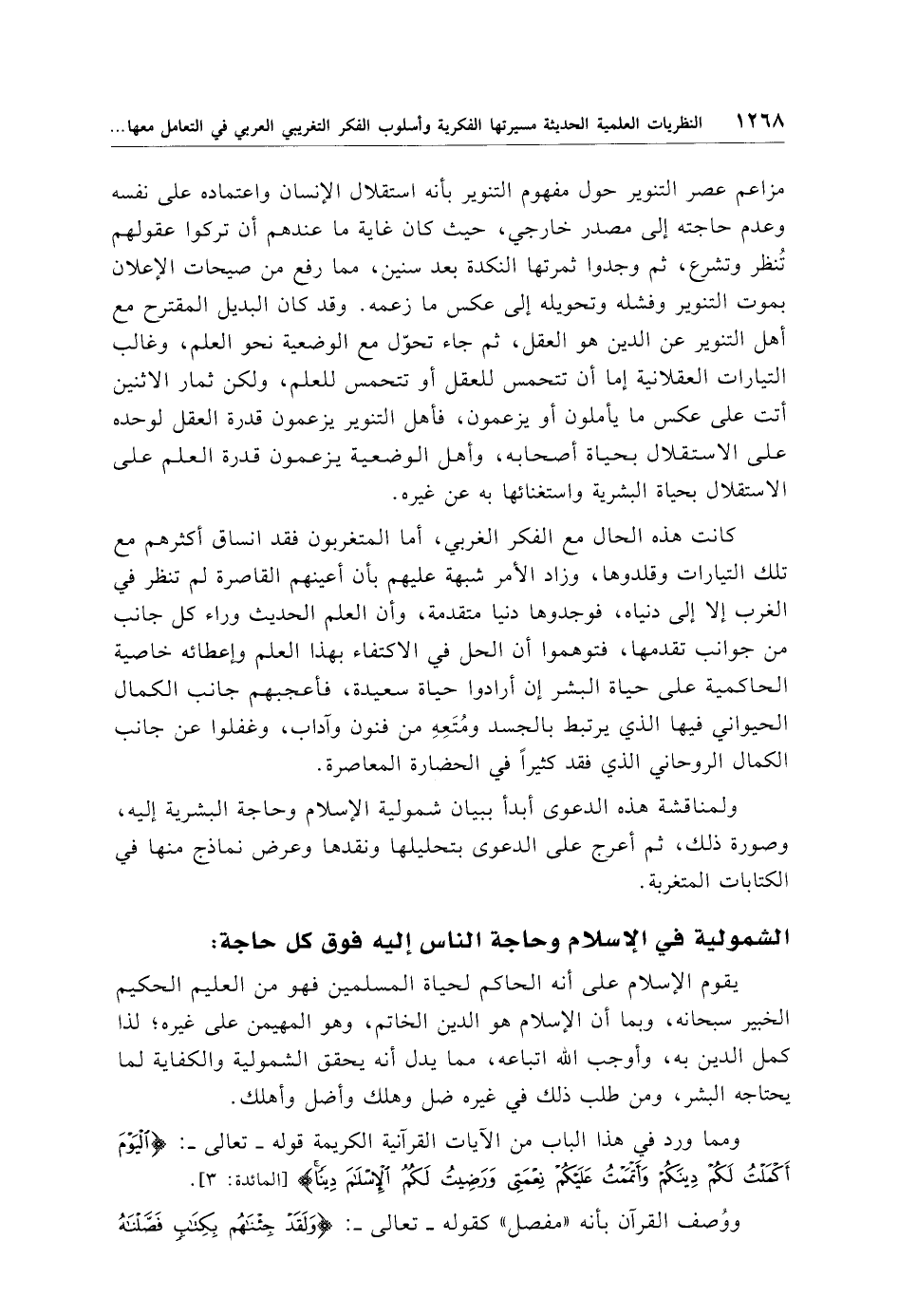 ولمناقشة هذه الدعوى أبدأ ببيان شمولية الإِسلام وحاجة البشرية إليه، وصورة ذلك، ثم أعرج على الدعوى بتحليلها ونقدها وعرض نماذج منها في الكتابات المتغربة.