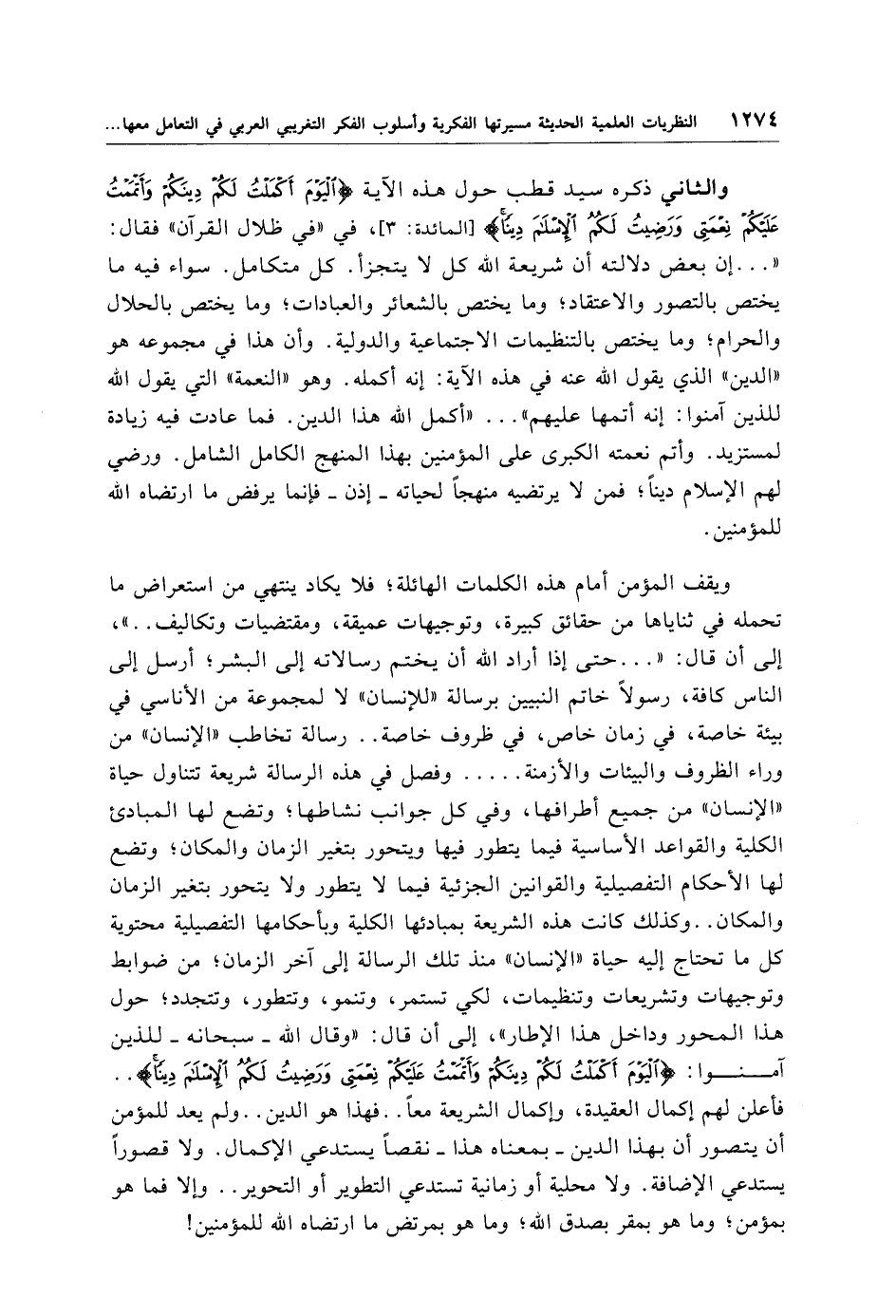 والثاني ذكره سيد قطب حول هذه الآية {الْيَوْمَ أَكْمَلْتُ لَكُمْ دِينَكُمْ وَأَتْمَمْتُ عَلَيْكُمْ نِعْمَتِي وَرَضِيتُ لَكُمُ الْإِسْلَامَ دِينًا} [المائدة: 3]، في "في ظلال القرآن" فقال: ". . . . إن بعض دلالته أن شريعة الله كل لا يتجزأ. كل متكامل. سواء فيه ما يختص بالتصور والاعتقاد؛ وما يختص بالشعائر والعبادات؛ وما يختص بالحلال والحرام؛ وما يختص بالتنظيمات الاجتماعية والدولية. وأن هذا في مجموعه هو "الدين" الذي يقول الله عنه في هذه الآية: إنه أكمله. وهو "النعمة" التي يقول الله للذين آمنوا: إنه أتمها عليهم". . . ."أكمل الله هذا الدين. فما عادت فيه زيادة لمستزيد. وأتم نعمته الكبرى على المؤمنين بهذا المنهج الكامل الشامل. ورضي لهم الإِسلام دينًا؛ فمن لا يرتضيه منهجًا لحياته -إذن- فإنما يرفض ما ارتضاه الله للمؤمنين.