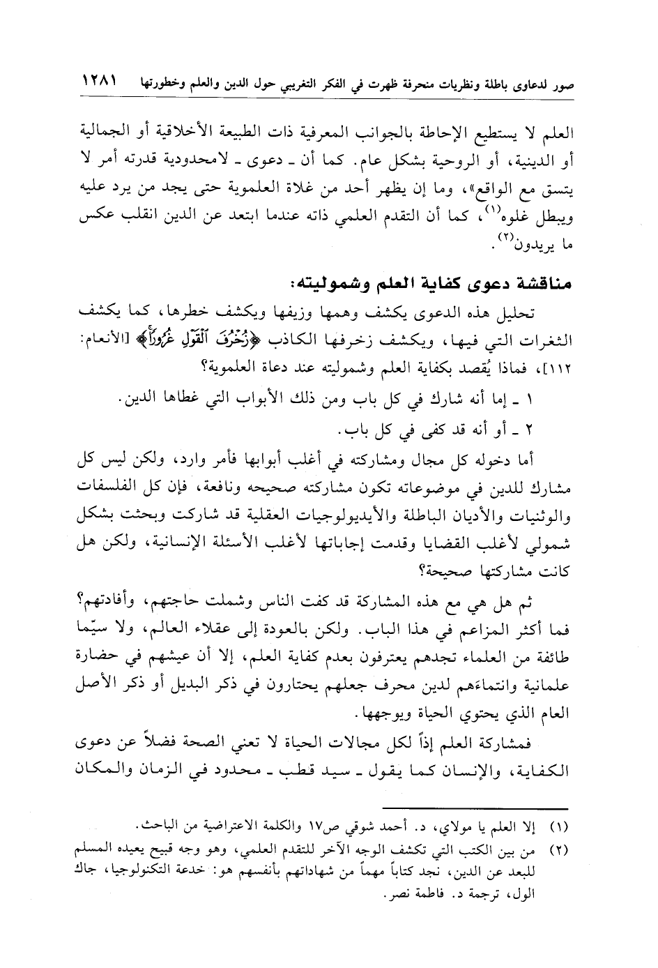العلم لا يستطيع الإحاطة بالجوانب المعرفية ذات الطبيعة الأخلاقية أو الجمالية أو الدينية، أو الروحية بشكل عام. كما أن -دعوى- لامحدودية قدرته أمر لا يتسق مع الواقع"، وما إن يظهر أحد من غلاة العلموية حتى يجد من يرد عليه ويبطل غلوه (¬1)، كما أن التقدم العلمي ذاته عندما ابتعد عن الدين انقلب عكس ما يريدون (¬2).