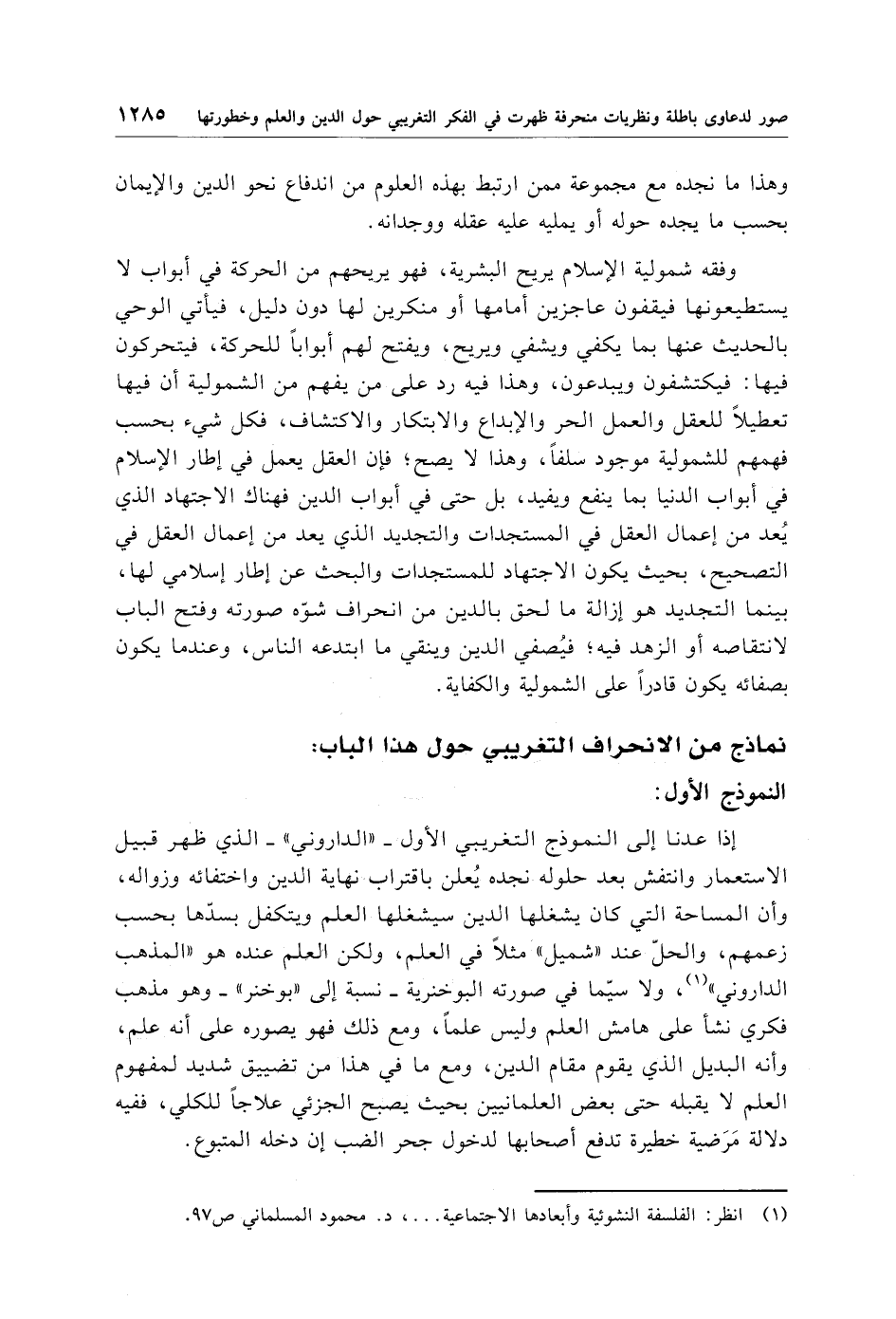 إذا عدنا إلى النموذج التغريبي الأول -"الداروني"- الذي ظهر قبيل الاستعمار وانتفش بعد حلوله نجده يُعلن باقتراب نهاية الدين واختفائه وزواله، وأن المساحة التي كان يشغلها الدين سيشغلها العلم ويتكفل بسدّها بحسب زعمهم، والحلّ عند "شميل" مثلًا في العلم، ولكن العلم عنده هو "المذهب الداروني" (¬1)، ولاسيّما في صورته البوخنرية -نسبة إلى "بوخنر"- وهو مذهب فكري نشأ على هامش العلم وليس علمًا، ومع ذلك فهو يصوره على أنه علم، وأنه البديل الذي يقوم مقام الدين، ومع ما في هذا من تضييق شديد لمفهوم العلم لا يقبله حتى بعض العلمانيين بحيث يصبح الجزئي علاجًا للكلي، ففيه دلالة مَرَضية خطيرة تدفع أصحابها لدخول جحر الضب إن دخله المتبوع.