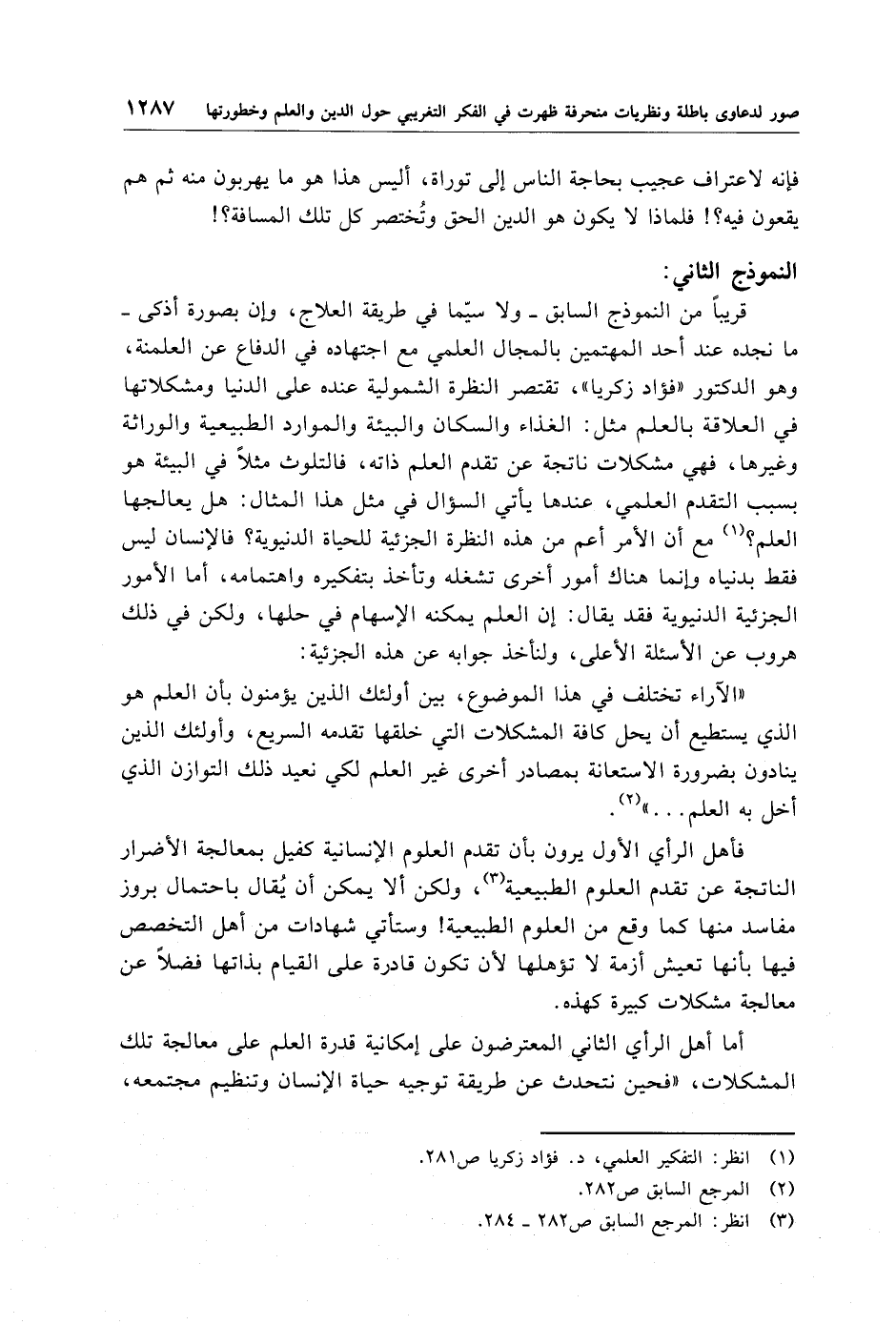 قريبًا من النموذج السابق -ولا سيّما في طريقة العلاج، وإن بصورة أذكى- ما نجده عند أحد المهتمين بالمجال العلمي مع اجتهاده في الدفاع عن العلمنة، وهو الدكتور "فؤاد زكريا"، تقتصر النظرة الشمولية عنده على الدنيا ومشكلاتها في العلاقة بالعلم مثل: الغذاء والسكان والبيئة والموارد الطبيعية والوراثة وغيرها، فهي مشكلات ناتجة عن تقدم العلم ذاته، فالتلوث مثلًا في البيئة هو بسبب التقدم العلمي، عندها يأتي السؤال في مثل هذا المثال: هل يعالجها العلم؟ (¬1) مع أن الأمر أعم من هذه النظرة الجزئية للحياة الدنيوية؟ فالإنسان ليس فقط بدنياه وإنما هناك أمور أخرى تشغله وتأخذ بتفكيره واهتمامه، أما الأمور الجزئية الدنيوية فقد يقال: إن العلم يمكنه الإسهام في حلها، ولكن في ذلك هروب عن الأسئلة الأعلى، ولنأخذ جوابه عن هذه الجزئية: