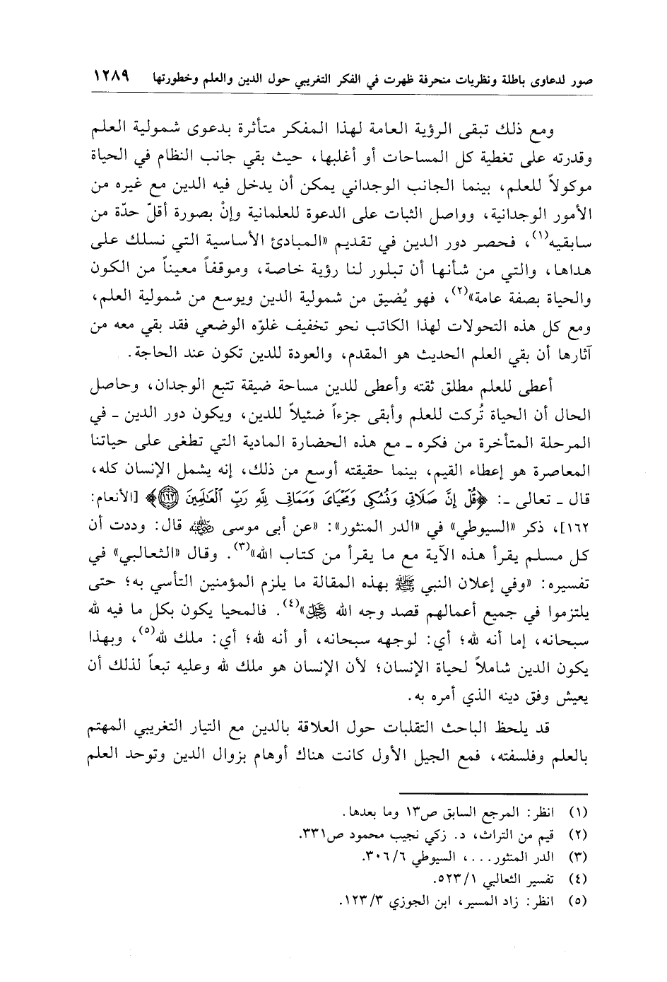 أعطى للعلم مطلق ثقته وأعطى للدين مساحة ضيقة تتبع الوجدان، وحاصل الحال أن الحياة تُركت للعلم وأبقى جزءًا ضئيلًا للدين، ويكون دور الدين -في المرحلة المتأخرة من فكره- مع هذه الحضارة المادية التي تطغى على حياتنا المعاصرة هو إعطاء القيم، بينما حقيقته أوسع من ذلك، إنه يشمل الإنسان كله، قال -تعالى-: {قُلْ إِنَّ صَلَاتِي وَنُسُكِي وَمَحْيَايَ وَمَمَاتِي لِلَّهِ رَبِّ الْعَالَمِينَ (162)} [الأنعام: 162]، ذكر "السيوطي" في "الدر المنثور": "عن أبي موسى - رضي الله عنه - قال: وددت أن كل مسلم يقرأ هذه الآية مع ما يقرأ من كتاب الله" (¬3). وقال "الثعالبي" في تفسيره: "وفي إعلان النبي - صلي الله عليه وسلم - بهذه المقالة ما يلزم المؤمنين التأسي به؛ حتى يلتزموا في جميع أعمالهم قصد وجه الله - عز وجل -" (¬4). فالمحيا يكون بكل ما فيه لله سبحانه، إما أنه لله؛ أي: لوجهه سبحانه، أو أنه لله؛ أي: ملك لله (¬5)، وبهذا يكون الدين شاملًا لحياة الإنسان؛ لأن الإنسان هو ملك لله وعليه تبعًا لذلك أن يعيش وفق دينه الذي أمره به.