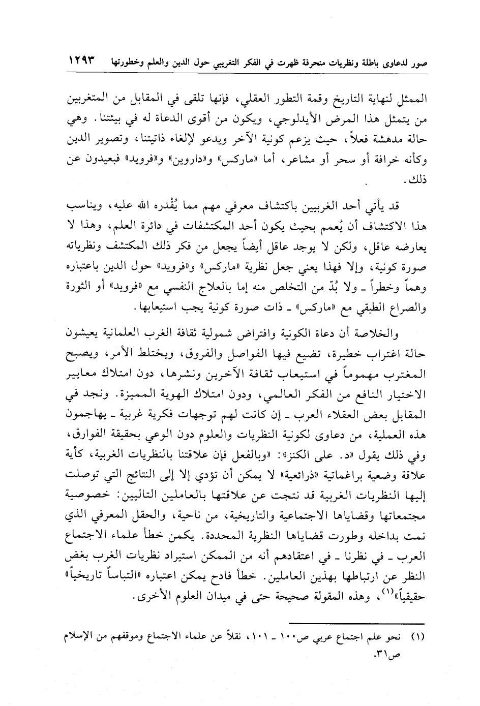 (¬1) نحو علم اجتماع عربي ص 100 - 101، نقلًا عن علماء الاجتماع وموقفهم من الإِسلام ص 31.