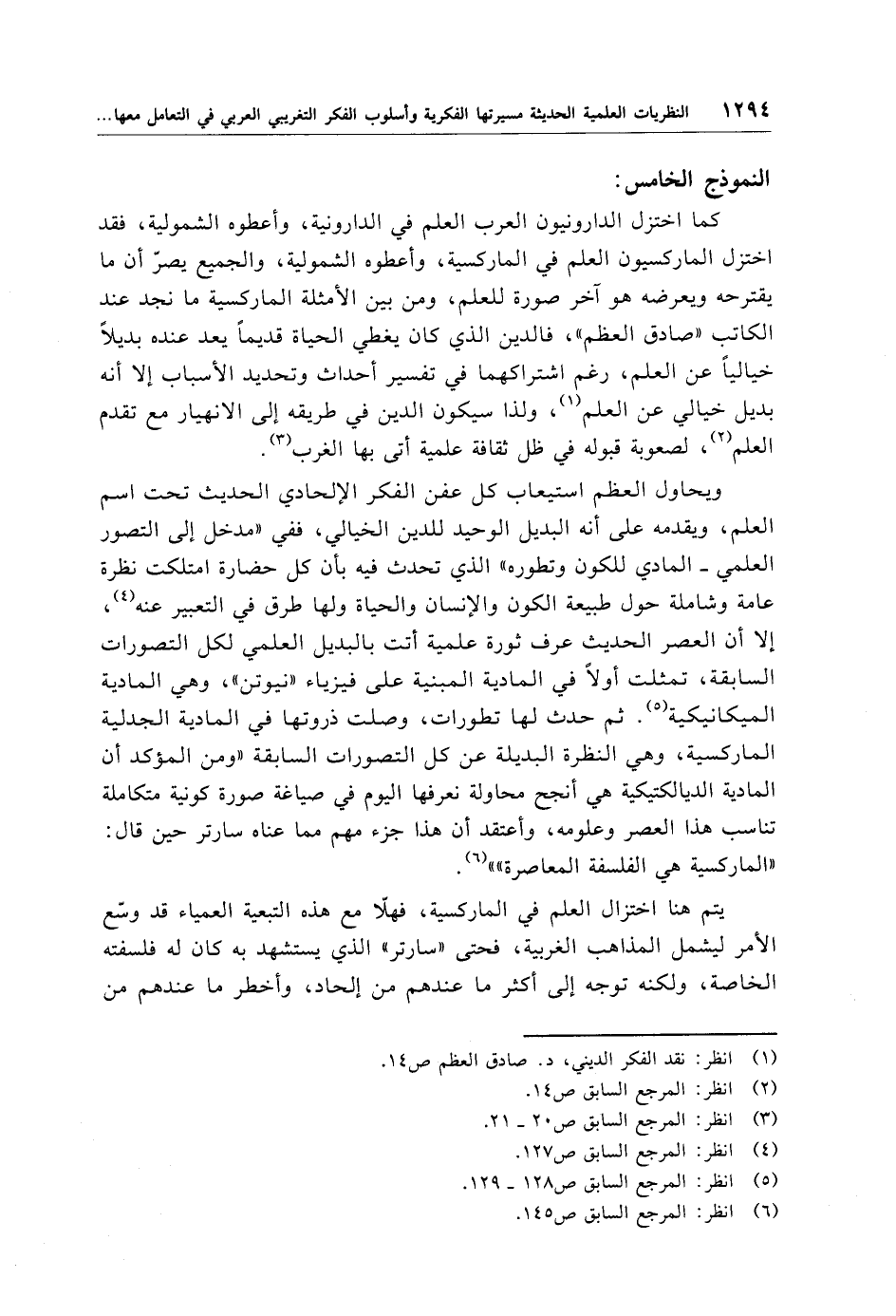 كما اختزل الدارونيون العرب العلم في الدارونية، وأعطوه الشمولية، فقد اختزل الماركسيون العلم في الماركسية، وأعطوه الشمولية، والجميع يصرّ أن ما يقترحه ويعرضه هو آخر صورة للعلم، ومن بين الأمثلة الماركسية ما نجد عند الكاتب "صادق العظم"، فالدين الذي كان يغطي الحياة قديمًا يعد عنده بديلًا خياليًا عن العلم، رغم اشتراكهما في تفسير أحداث وتحديد الأسباب إلا أنه بديل خيالي عن العلم (¬1)، ولذا سيكون الدين في طريقه إلى الانهيار مع تقدم العلم (¬2)، لصعوبة قبوله في ظل ثقافة علمية أتى بها الغرب (¬3).