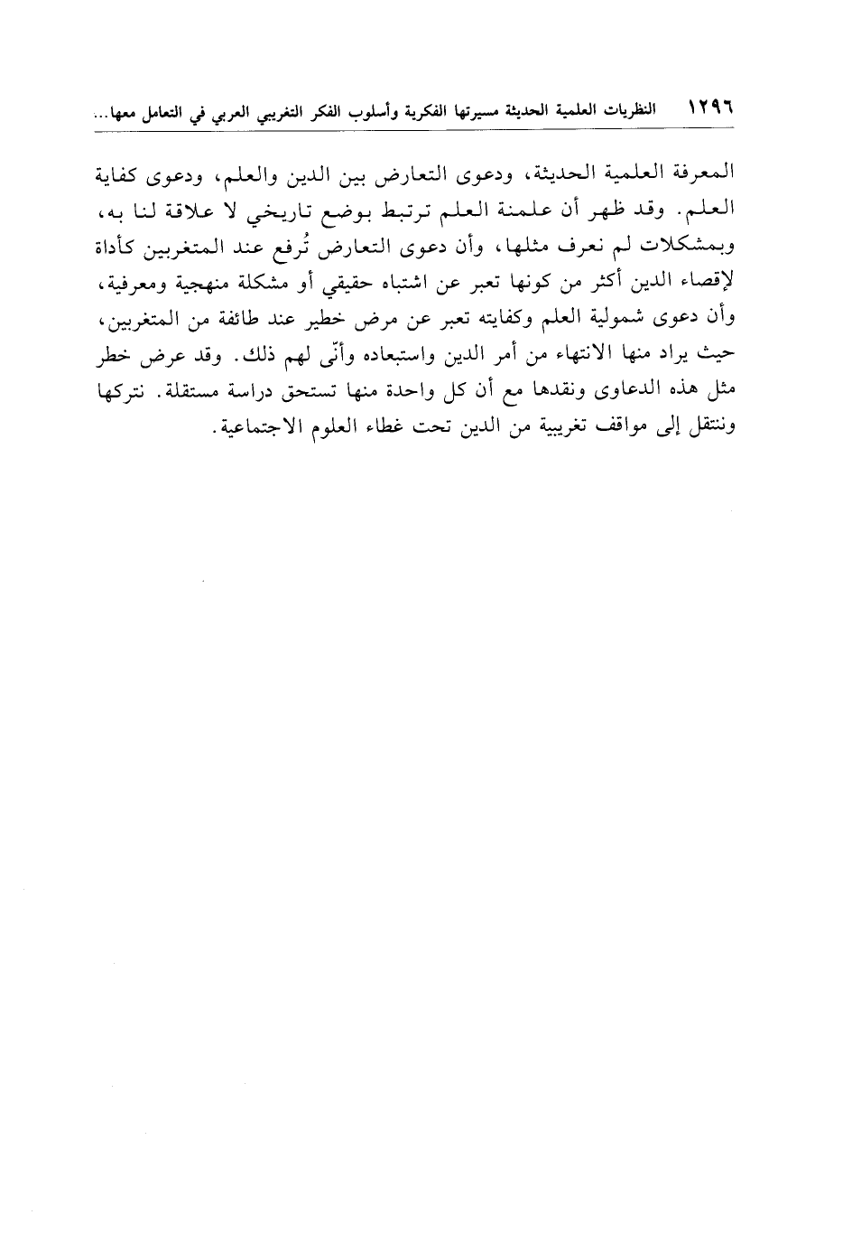 المعرفة العلمية الحديثة، ودعوى التعارض بين الدين والعلم، ودعوى كفاية العلم. وقد ظهر أن علمنة العلم ترتبط بوضع تاريخي لا علاقة لنا به، وبمشكلات لم نعرف مثلها، وأن دعوى التعارض تُرفع عند المتغربين كأداة لإقصاء الدين أكثر من كونها تعبر عن اشتباه حقيقي أو مشكلة منهجية ومعرفية، وأن دعوى شمولية العلم وكفايته تعبر عن مرض خطير عند طائفة من المتغربين، حيث يراد منها الانتهاء من أمر الدين واستبعاده وأنّى لهم ذلك. وقد عرض خطر مثل هذه الدعاوى ونقدها مع أن كل واحدة منها تستحق دراسة مستقلة. نتركها وننتقل إلى مواقف تغريبية من الدين تحت غطاء العلوم الاجتماعية.