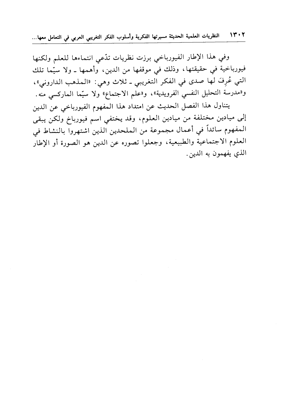 وفي هذا الإطار الفيورباخي برزت نظريات تدّعي انتماءها للعلم ولكنها فيورباخية في حقيقتها، وذلك في موقفها من الدين، وأهمها -ولاسيّما تلك التي عُرِفَ لها صدى في الفكر التغريبي- ثلاث وهي: "المذهب الداروني"، و"مدرسة التحليل النفسي الفرويدية"، و"علم الاجتماع" ولاسيّما الماركسي منه.
