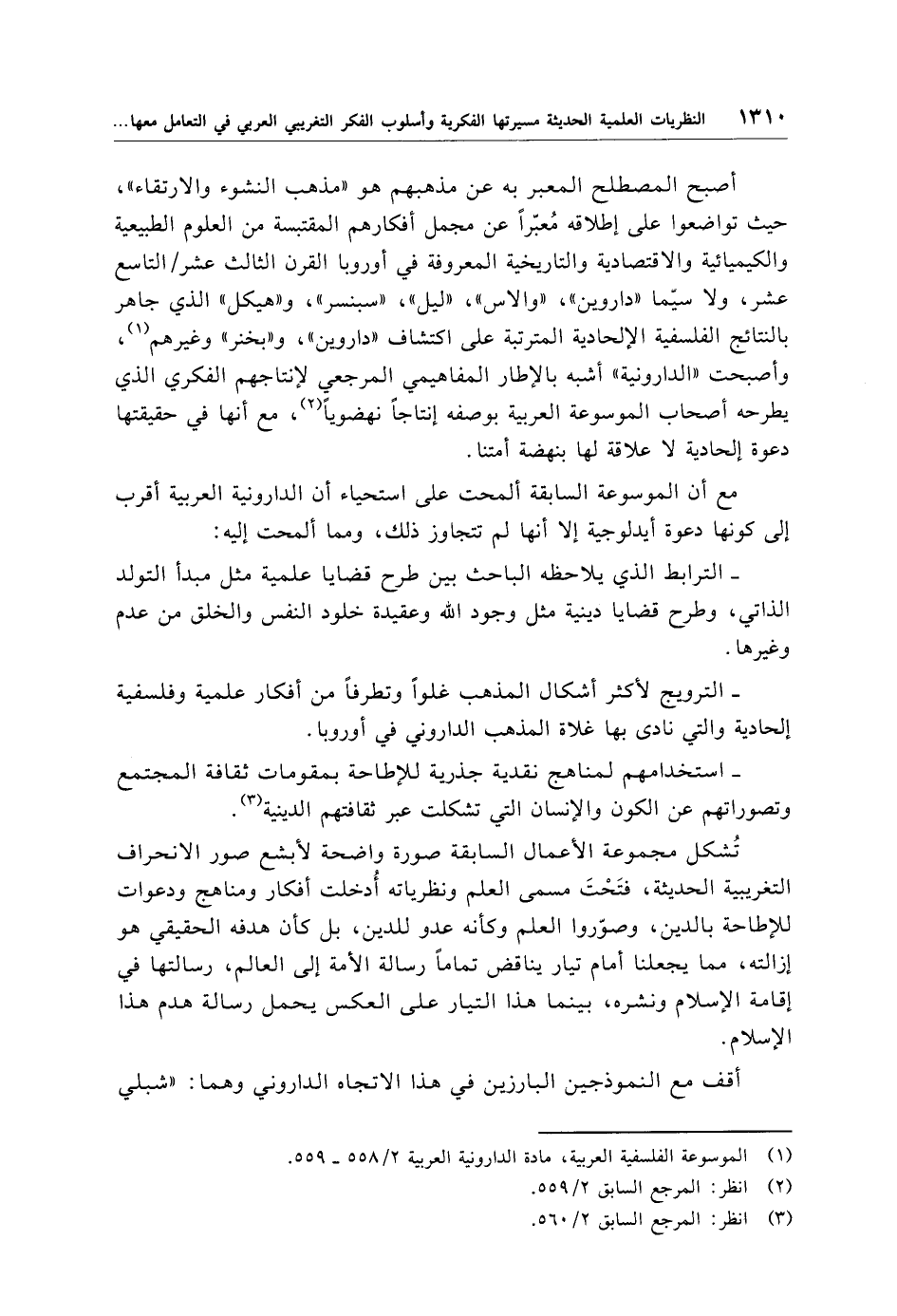 (¬1) الموسوعة الفلسفية العربية، مادة الدارونية العربية 2/ 558 - 559.