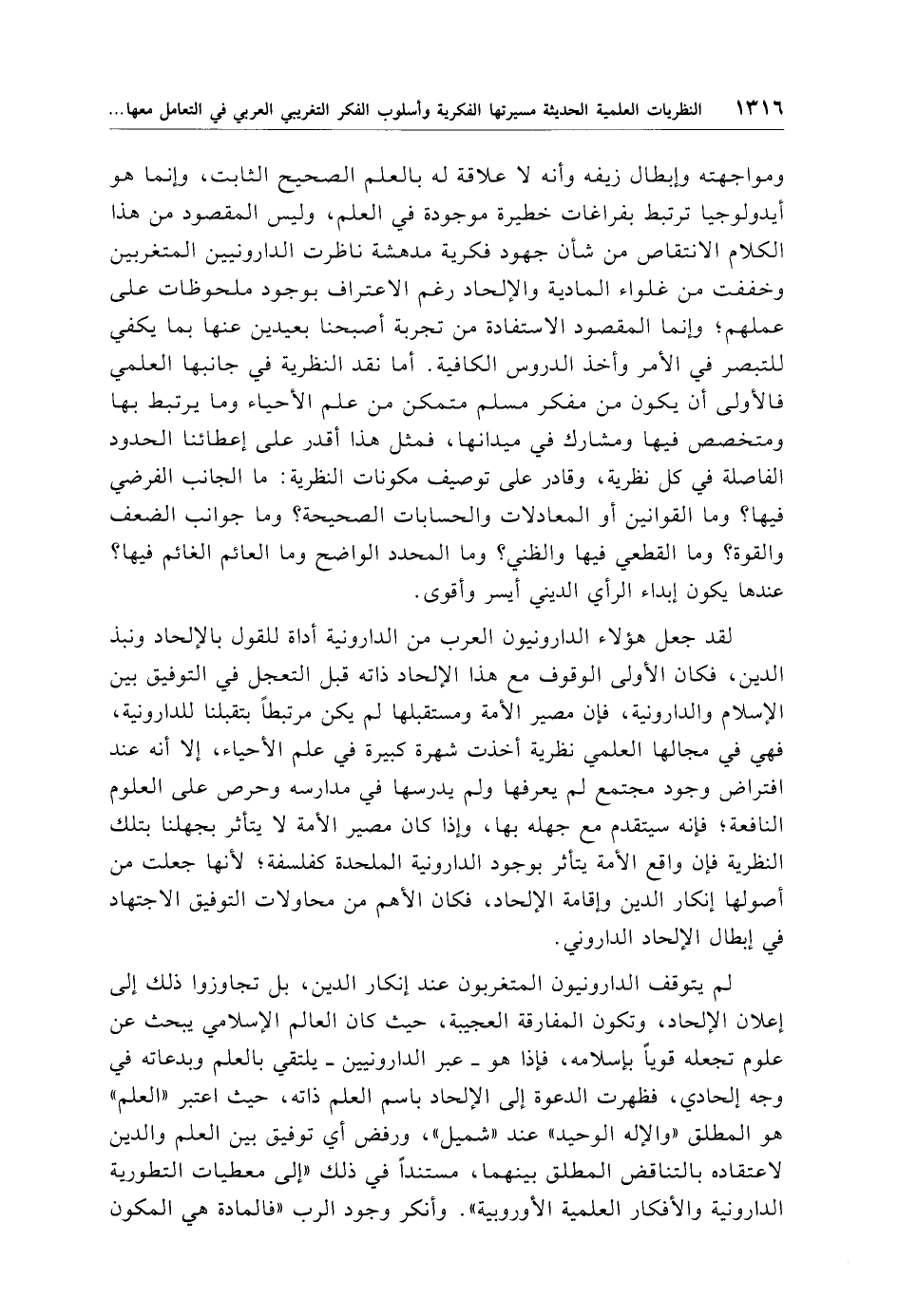 ومواجهته وإبطال زيفه وأنه لا علاقة له بالعلم الصحيح الثابت، وإنما هو أيدولوجيا ترتبط بفراغات خطيرة موجودة في العلم، وليس المقصود من هذا الكلام الانتقاص من شأن جهود فكرية مدهشة ناظرت الدارونيين المتغربين وخفف من غلواء المادية والإلحاد رغم الاعتراف بوجود ملحوظات على عملهم؛ وإنما المقصود الاستفادة من تجربة أصبحنا بعيدين عنها بما يكفي للتبصر في الأمر وأخذ الدروس الكافية. أما نقد النظرية في جانبها العلمي فالأولى أن يكون من مفكر مسلم متمكن من علم الأحياء وما يرتبط بها ومتخصص فيها ومشارك في ميدانها، فمثل هذا أقدر على إعطائنا الحدود الفاصلة في كل نظرية، وقادر على توصيف مكونات النظرية: ما الجانب الفرضي فيها؟ وما القوانين أو المعادلات والحسابات الصحيحة؟ وما جوانب الضعف والقوة؟ وما القطعي فيها والظني؟ وما المحدد الواضح وما العام الغائم فيها؟ عندها يكون إبداء الرأي الديني أيسر وأقوى.
