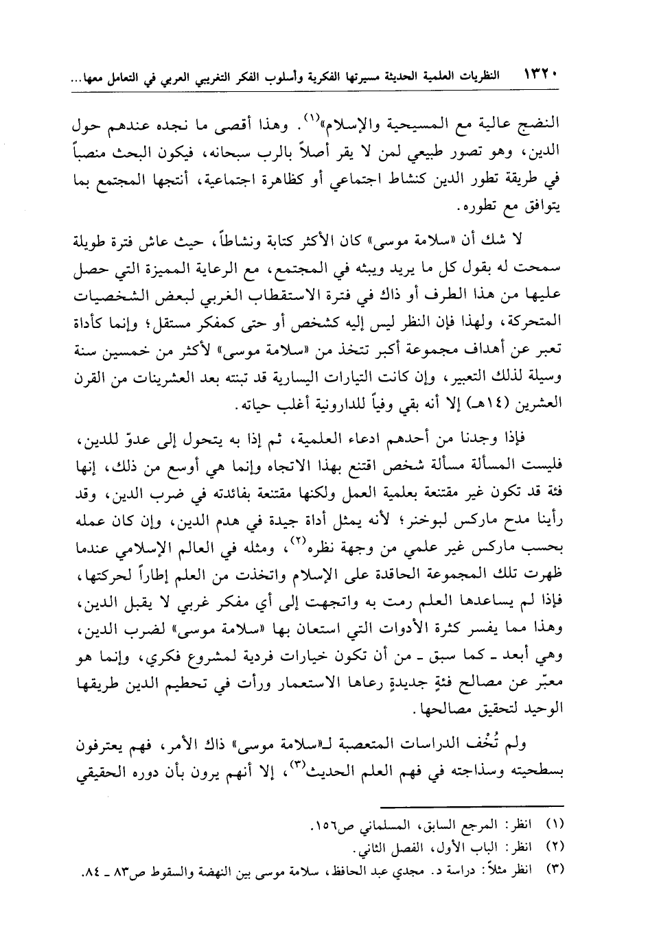 فإذا وجدنا من أحدهم ادعاء العلمية، ثم إذا به يتحول إلى عدوّ للدين، فليست المسألة مسألة شخص اقتنع بهذا الاتجاه وإنما هي أوسع من ذلك، إنها فئة قد تكون غير مقتنعة بعلمية العمل ولكنها مقتنعة بفائدته في ضرب الدين، وقد رأينا مدح ماركس لبوخنر؛ لأنه يمثل أداة جيدة في هدم الدين، وإن كان عمله بحسب ماركس غير علمي من وجهة نظره (¬2)، ومثله في العالم الإسلامي عندما ظهرت تلك المجموعة الحاقدة على الإسلام واتخذت من العلم إطارًا لحركتها، فإذا لم يساعدها العلم رمت به واتجهت إلى أي مفكر غربي لا يقبل الدين، وهذا مما يفسر كثرة الأدوات التي استعان بها "سلامة موسى" لضرب الدين، وهي أبعد -كما سبق- من أن تكون خيارات فردية لمشروع فكري، وإنما هو معبّر عن مصالح فئةٍ جديدةٍ رعاها الاستعمار ورأت في تحطيم الدين طريقها الوحيد لتحقيق مصالحها.