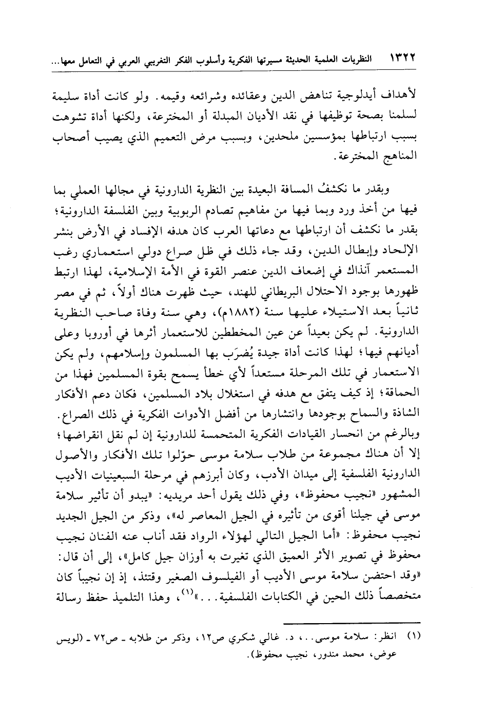 وبقدر ما نكشفُ المسافة البعيدة بين النظرية الدارونية في مجالها العملي بما فيها من أخذ ورد وبما فيها من مفاهيم تصادم الربوبية وبين الفلسفة الدارونية؛ بقدر ما نكشف أن ارتباطها مع دعاتها العرب كان هدفه الإفساد في الأرض بنشر الإلحاد وإبطال الدين، وقد جاء ذلك في ظل صراع دولي استعماري رغب المستعمر آنذاك في إضعاف الدين عنصر القوة في الأمة الإسلامية، لهذا ارتبط ظهورها بوجود الاحتلال البريطاني للهند، حيث ظهرت هناك أولًا، ثم في مصر ثانيًا بعد الاستيلاء عليها سنة (1882 م)، وهي سنة وفاة صاحب النظرية الدارونية. لم يكن بعيدًا عن عين المخططين للاستعمار أثرها في أوروبا وعلى أديانهم فيها؛ لهذا كانت أداة جيدة يُضرَب بها المسلمون وإسلامهم، ولم يكن الاستعمار في تلك المرحلة مستعدًا لأي خطأ يسمح بقوة المسلمين فهذا من الحماقة؛ إذ كيف يتفق مع هدفه في استغلال بلاد المسلمين، فكان دعم الأفكار الشاذة والسماح بوجودها وانتشارها من أفضل الأدوات الفكرية في ذلك الصراع. وبالرغم من انحسار القيادات الفكرية المتحمسة للدارونية إن لم نقل انقراضها؛ إلا أن هناك مجموعة من طلاب سلامة موسى حوّلوا تلك الأفكار والأصول الدارونية الفلسفية إلى ميدان الأدب، وكان أبرزهم في مرحلة السبعينيات الأديب المشهور "نجيب محفوظ"، وفي ذلك يقول أحد مريديه: "يبدو أن تأثير سلامة موسى في جيلنا أقوى من تأثيره في الجيل المعاصر له"، وذكر من الجيل الجديد نجيب محفوظ: "أما الجيل التالي لهؤلاء الرواد فقد أناب عنه الفنان نجيب محفوظ في تصوير الأثر العميق الذي تغيرت به أوزان جيل كامل"، إلى أن قال: "وقد احتضن سلامة موسى الأديب أو الفيلسوف الصغير وقتئذ، إذ إن نجيبًا كان متخصصًا ذلك الحين في الكتابات الفلسفية. . . ." (¬1)، وهذا التلميذ حفظ رسالة