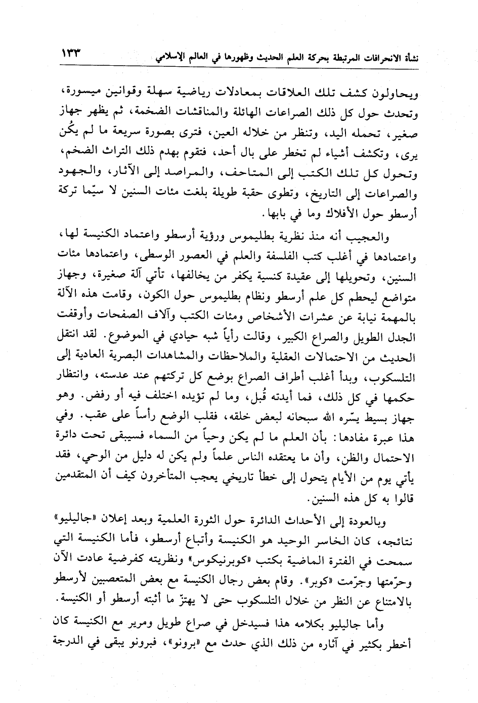 ويحاولون كشف تلك العلاقات بمعادلات رياضية سهلة وقوانين ميسورة، وتحدث حول كل ذلك الصراعات الهائلة والمناقشات الضخمة، ثم يظهر جهاز صغير، تحمله اليد، وتنظر من خلاله العين، فترى بصورة سريعة ما لم يكُن يرى، وتكشف أشياء لم تخطر على بال أحد، فتقوم بهدم ذلك التراث الضخم، وتحول كل تلك الكتب إلى المتاحف، والمراصد إلى الآثار، والجهود والصراعات إلى التاريخ، وتطوى حقبة طويلة بلغت مئات السنين لاسيّما تركة أرسطو حول الأفلاك وما في بابها.