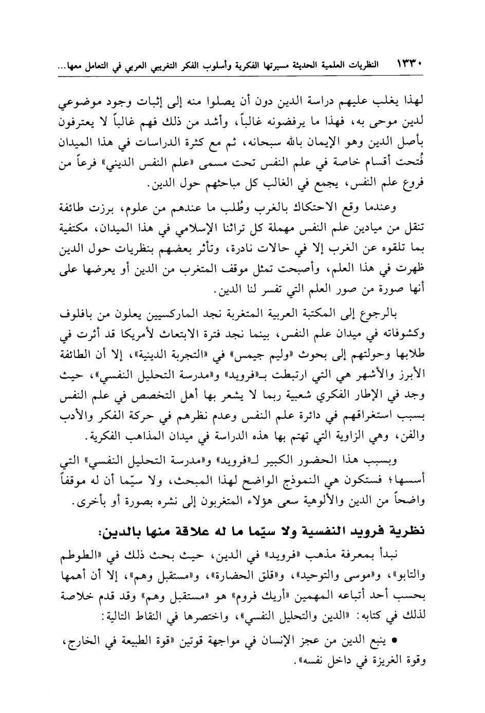 وعندما وقع الاحتكاك بالغرب وطُلب ما عندهم من علوم، برزت طائفة تنقل من ميادين علم النفس مهملة كل تراثنا الإسلامي في هذا الميدان، مكتفية بما تلقوه عن الغرب إلا في حالات نادرة، وتأثر بعضهم بنظريات حول الدين ظهرت في هذا العلم، وأصبحت تمثل موقف المتغرب من الدين أو يعرضها على أنها صورة من صور العلم التي تفسر لنا الدين.