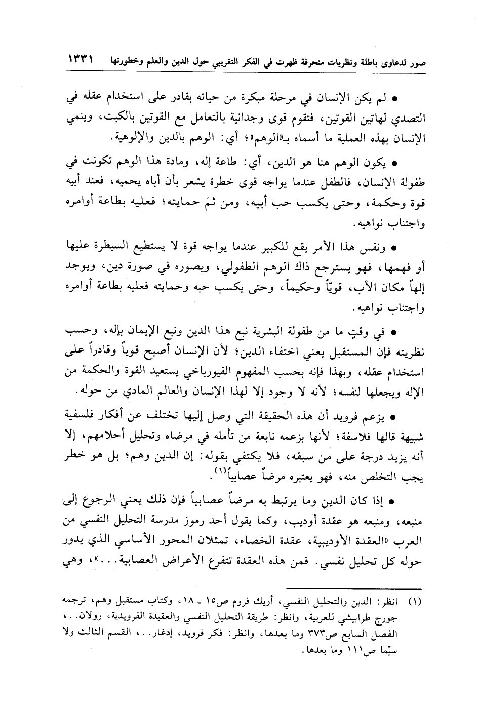 (¬1) انظر: الدين والتحليل النفسي، أريك فروم ص 15 - 18، وكتاب مستقبل وهم، ترجمه جورج طرابيشي للعربية، وانظر: طريقة التحليل النفسي والعقيدة الفرويدية، رولان .. ، الفصل السابع ص 373 وما بعدها، وانظر: فكر فرويد، إدغار .. ، القسم الثالث ولاسيّما ص 111 وما بعدها.