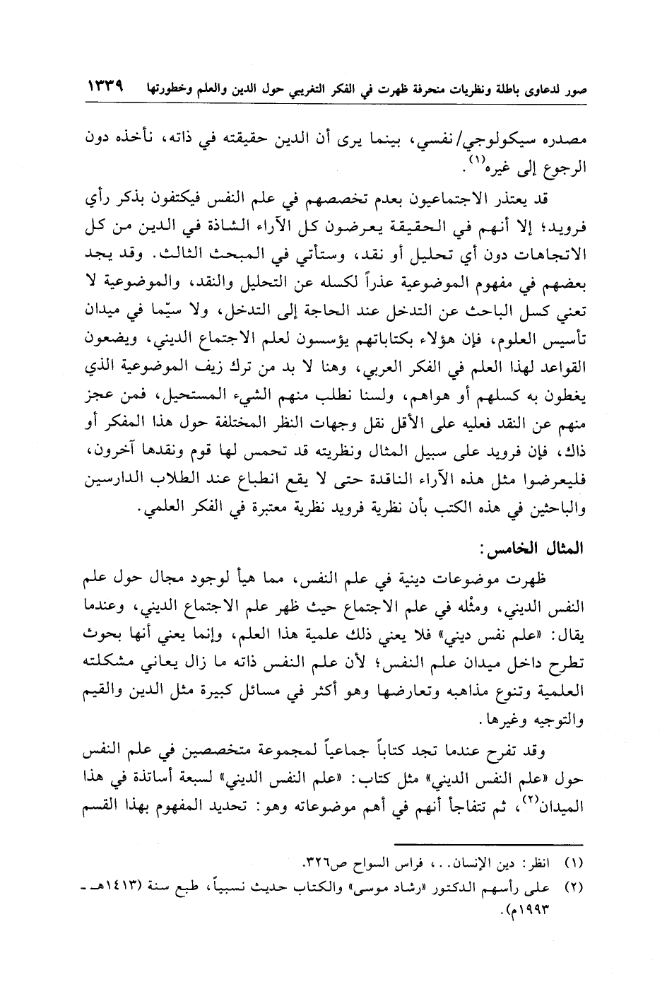 قد يعتذر الاجتماعيون بعدم تخصصهم في علم النفس فيكتفون بذكر رأي فرويد؛ إلا أنهم في الحقيقة يعرضون كل الآراء الشاذة في الدين من كل الاتجاهات دون أي تحليل أو نقد، وستأتي في المبحث الثالث. وقد يجد بعضهم في مفهوم الموضوعية عذرًا لكسله عن التحليل والنقد، والموضوعية لا تعني كسل الباحث عن التدخل عند الحاجة إلى التدخل، ولاسيّما في ميدان تأسيس العلوم، فإن هؤلاء بكتاباتهم يؤسسون لعلم الاجتماع الديني، ويضعون القواعد لهذا العلم في الفكر العربي، وهنا لابد من ترك زيف الموضوعية الذي يغطون به كسلهم أو هواهم، ولسنا نطلب منهم الشيء المستحيل، فمن عجز منهم عن النقد فعليه على الأقل نقل وجهات النظر المختلفة حول هذا المفكر أو ذاك، فإن فرويد على سبيل المثال ونظريته قد تحمس لها قوم ونقدها آخرون، فليعرضوا مثل هذه الآراء الناقدة حتى لا يقع انطباع عند الطلاب الدارسين والباحثين في هذه الكتب بأن نظرية فرويد نظرية معتبرة في الفكر العلمي.