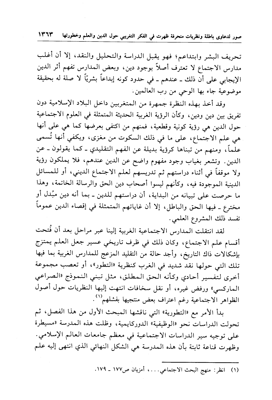 وقد أخذ بهذه النظرة جمهرة من المتغربين داخل البلاد الإِسلامية دون تفريق بين دين ودين، وكأن الرؤية الغربية الحديثة المتمثلة في العلوم الاجتماعية حول الدين هي رؤية كونية وقطعية، فمنهم من اكتفى بعرضها كما هي على أنها هي علم الاجتماع، على ما في ذلك السكوت من مغزى، ويكفي أنها تُسمى علمًا، ومنهم من تبناها كرؤية بديلة عن الفهم التقليدي -كما يقولون- عن الدين. وتشعر بغياب وجود مفهوم واضح عن الدين عندهم، فلا يملكون رؤية ولا موقفًا في أثناء دراستهم ثم تدريسهم لعلم الاجتماع الديني، أو للمسائل الدينية الموجودة فيه، وكأنهم ليسوا أصحاب دين الحق والرسالة الخاتمة، وهذا ما حرصت على تبيانه من البداية، أن دراستهم للدين -بما أنه دين مُبدل أو مخترع- فيها الحق والباطل، إلا أن غاياتهم المتمثلة في إقصاء الدين عمومًا تفسد ذلك المشروع العلمي.